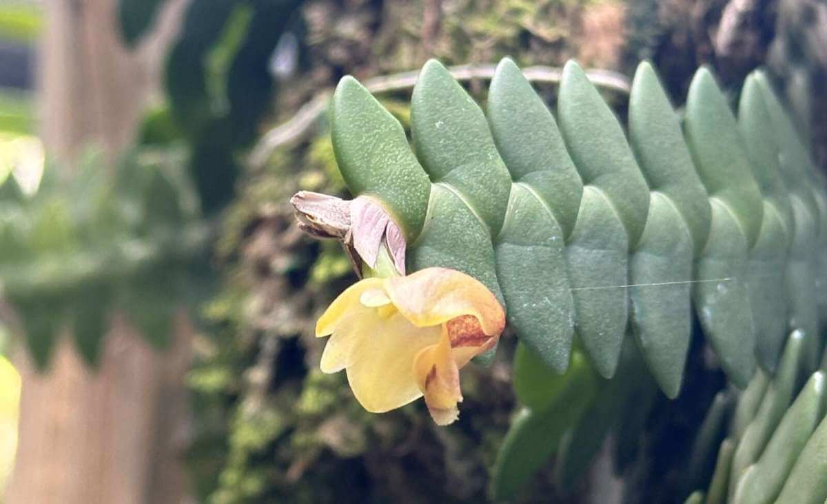Dendrobium leonis is an epiphytic orchid, meaning it typically grows on other plants or surfaces without causing harm. Its pseudobulbs, which store water and nutrients, have an elongated and cane-like structure. The leaves are leathery and can vary in size, depending on the specific conditions in which the orchid is cultivated.