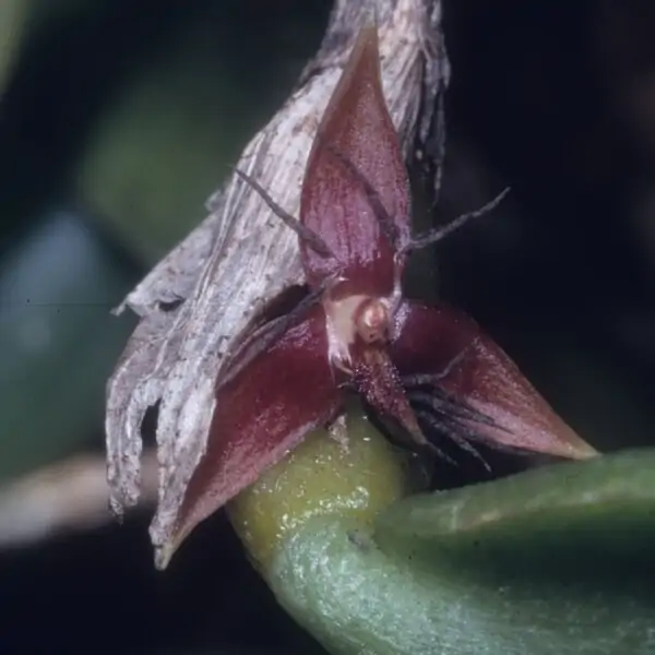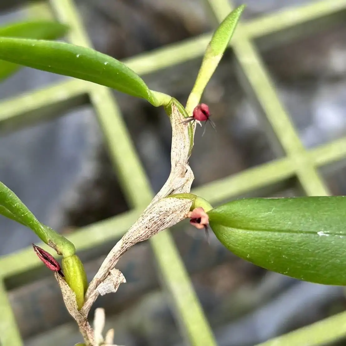 The flowers of Bulbophyllum haniffii are deep red and very tiny, measuring about 1 cm in size. They are produced on a basal, very short, single-flowered inflorescence. The flowers are short-lived, but the plant can produce multiple inflorescences throughout the year.