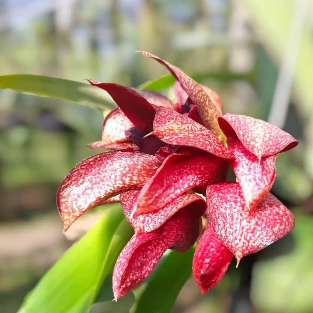 Bulbophyllum Pride of Papua (Bulbophyllum cruentum x Bulbophyllum phalaenopsis) come together to create this hybrid. It gets its bright red flowers and small size from Bulb cruentum, and the graceful, hanging clusters of flowers and bigger size come from Bulbophyllum phalaenopsis.