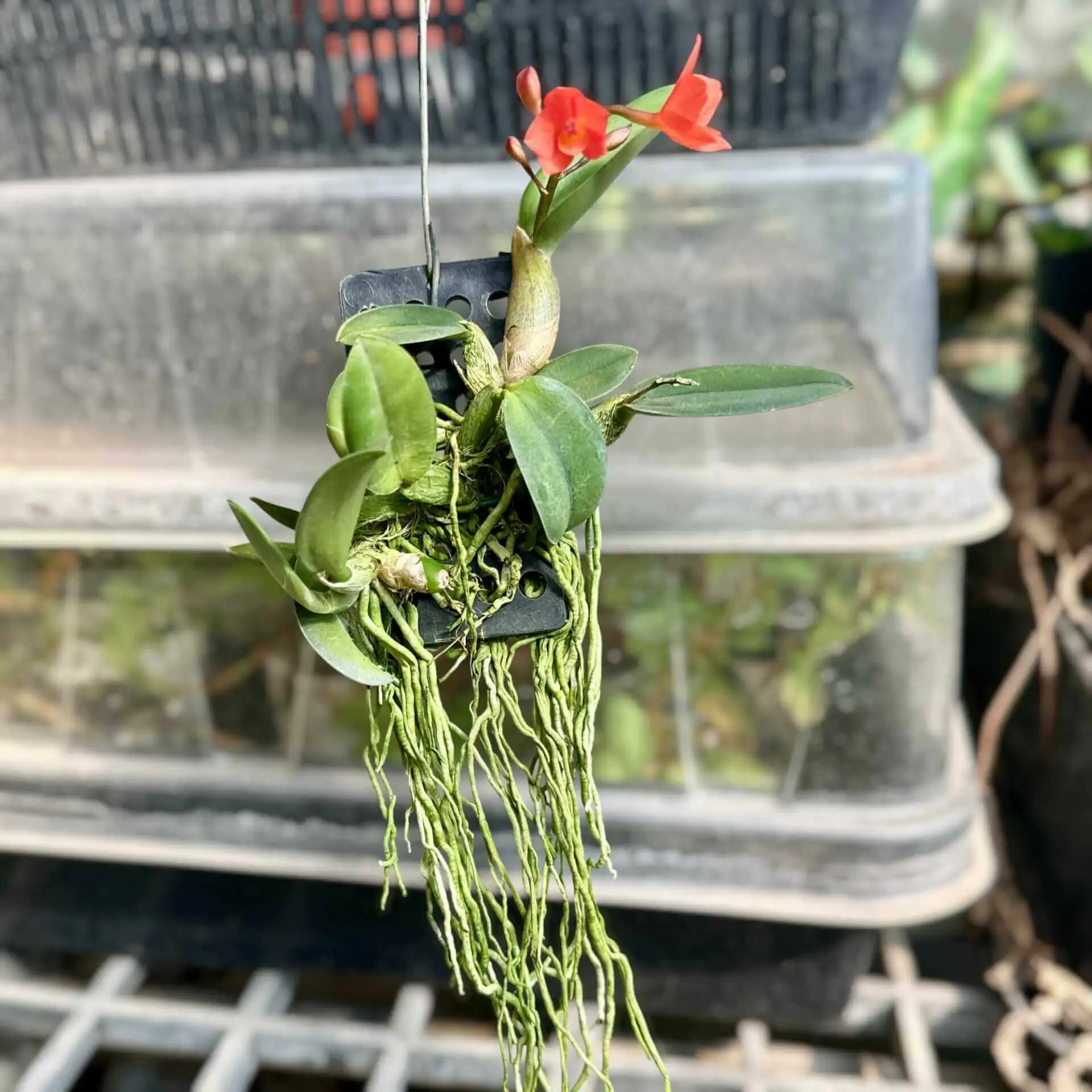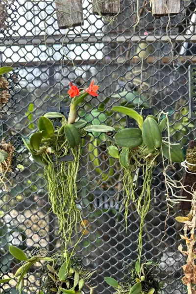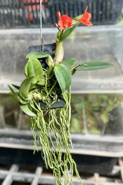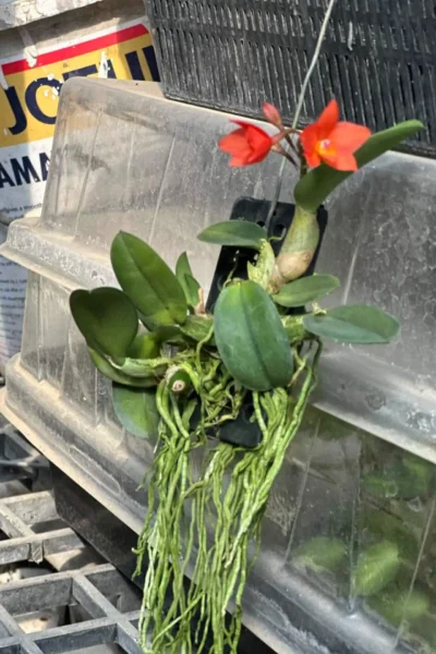 Cattleya cernua, (Sophronitis cernua) also known as the “dwarf Cattleya,” is a compact, epiphytic orchid known for its vibrant, fiery red to orange blooms. Native to Brazil, this species is ideal for small spaces due to its miniature size, typically growing just a few inches tall. Cattleya cernua thrives in warm, bright conditions with moderate humidity, making it a delightful addition for orchid enthusiasts who enjoy smaller, yet strikingly colorful plants.