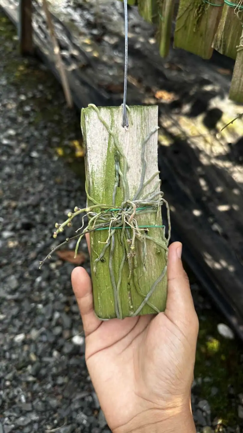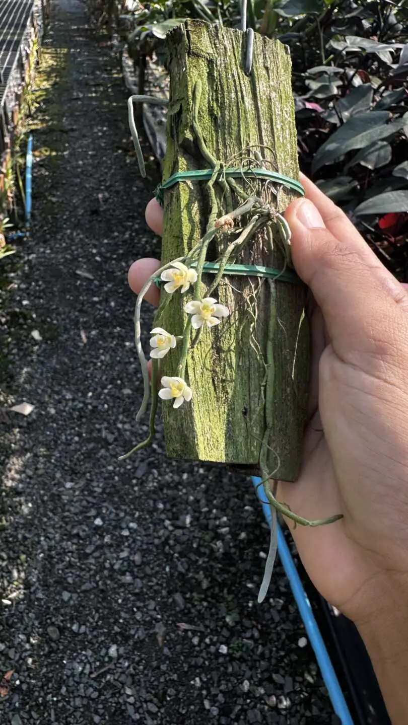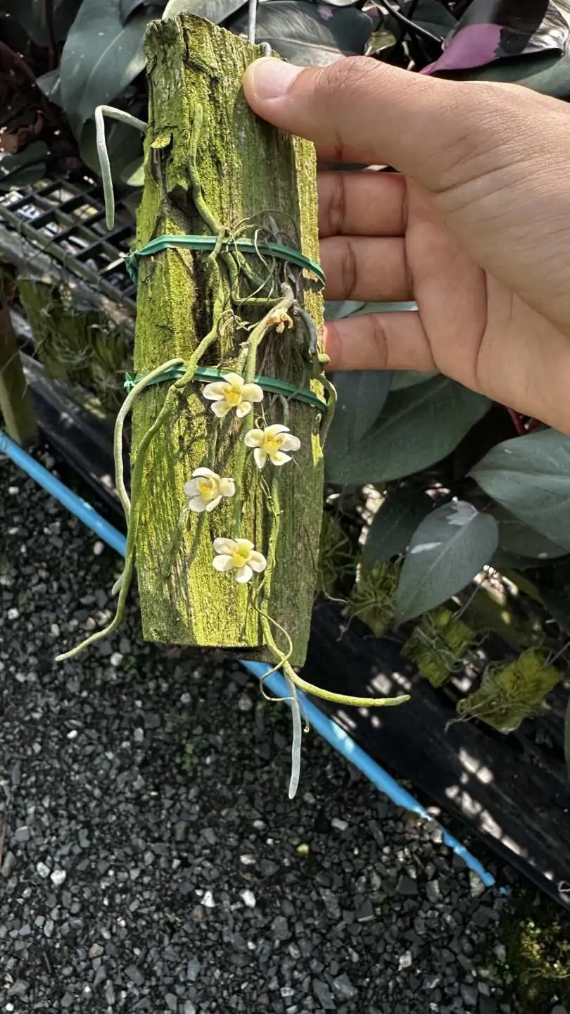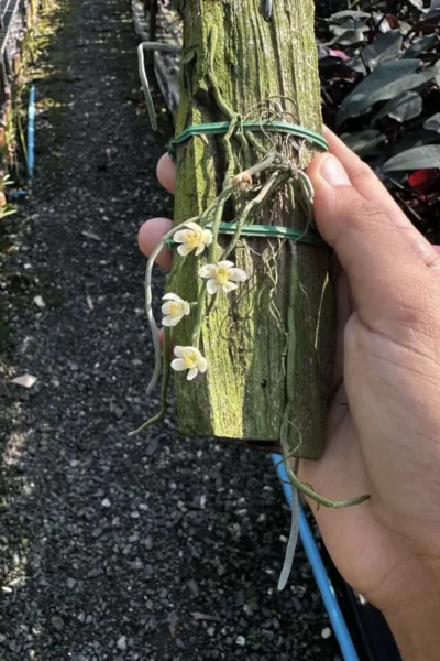 This orchid is native to tropical forests and grows on tree branches in warm, humid places. It blooms with small, beautiful flowers that often have a sweet scent. The flowers appear directly from the roots and are a lovely surprise when in bloom.