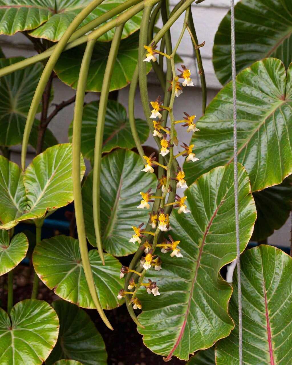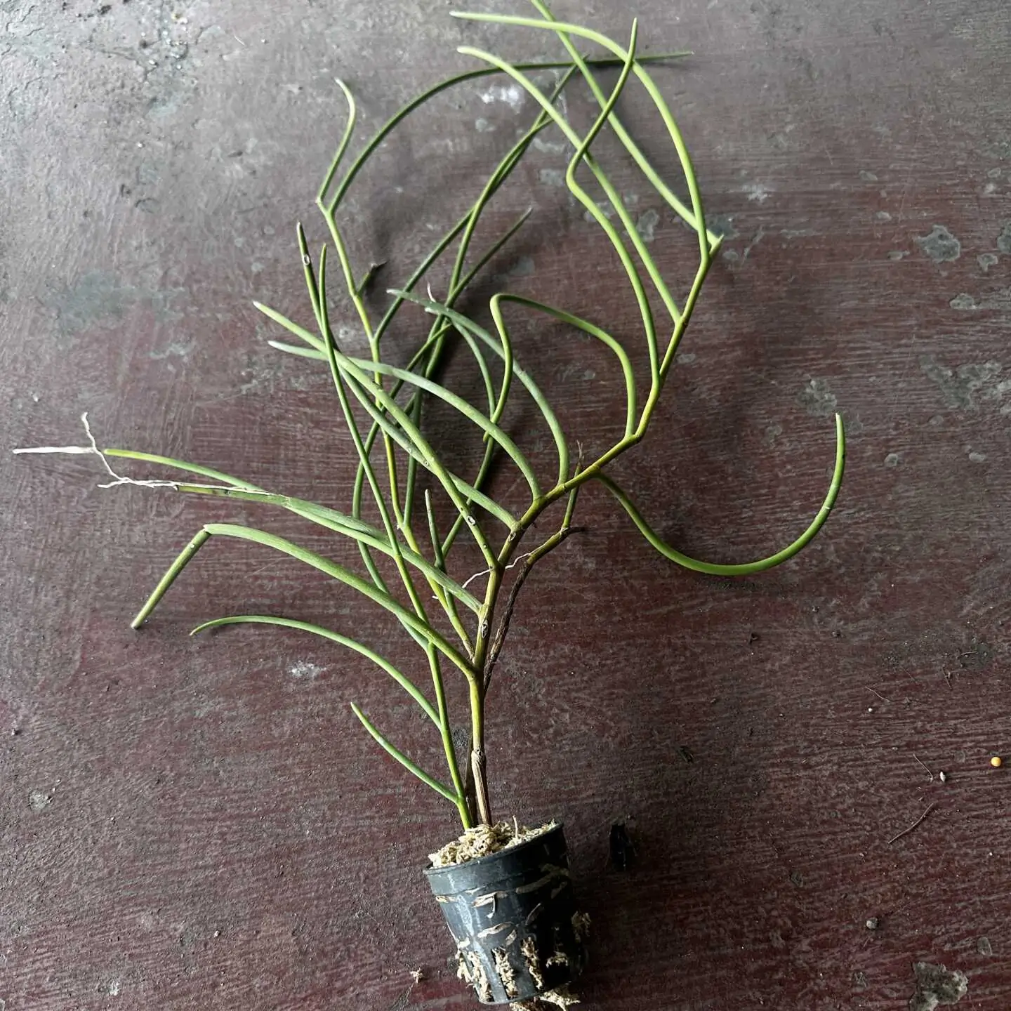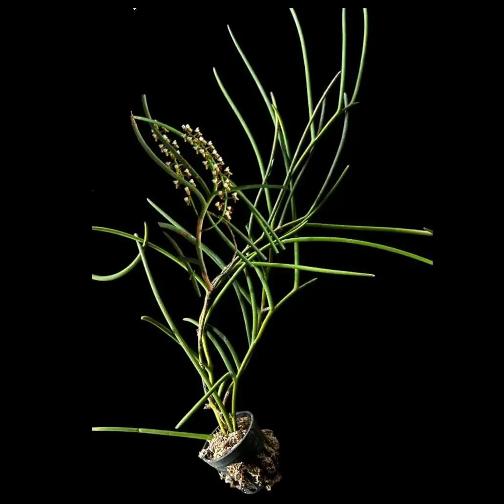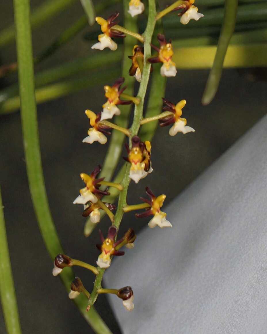 Cleisostoma fuerstenbergianum is a small to medium-sized epiphytic orchid native to Southeast Asia. It features slender, terete leaves and produces attractive, long-lasting flowers on arching or pendulous inflorescences. The blooms are typically greenish to yellow with purple or brown markings, and often appear in clusters. This species thrives in warm to intermediate temperatures with bright, filtered light and high humidity. It prefers good air movement and should be grown mounted or in baskets with coarse media to allow roots to dry quickly between waterings.