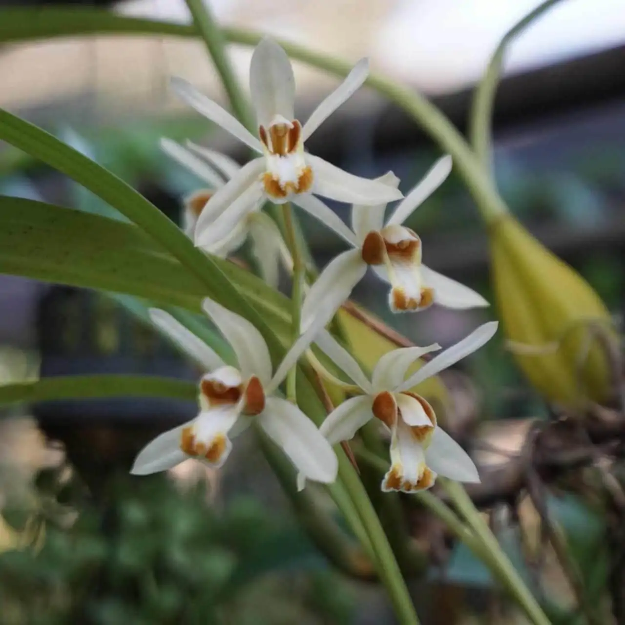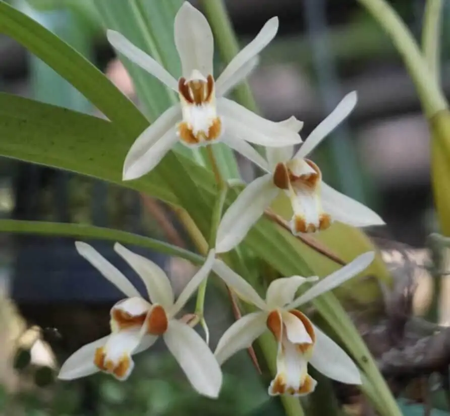 Coelogyne trinervis known for its elegant, fragrant flowers and unique appearance. It features long, arching spikes of delicate white to creamy-yellow blossoms, each adorned with intricate markings. Ideal for intermediate to warm climates, this orchid thrives in bright, indirect light with regular watering and humidity. Coelogyne trinervis adds a tropical and exotic touch to any orchid collection, making it a prized choice for enthusiasts and collectors alike.