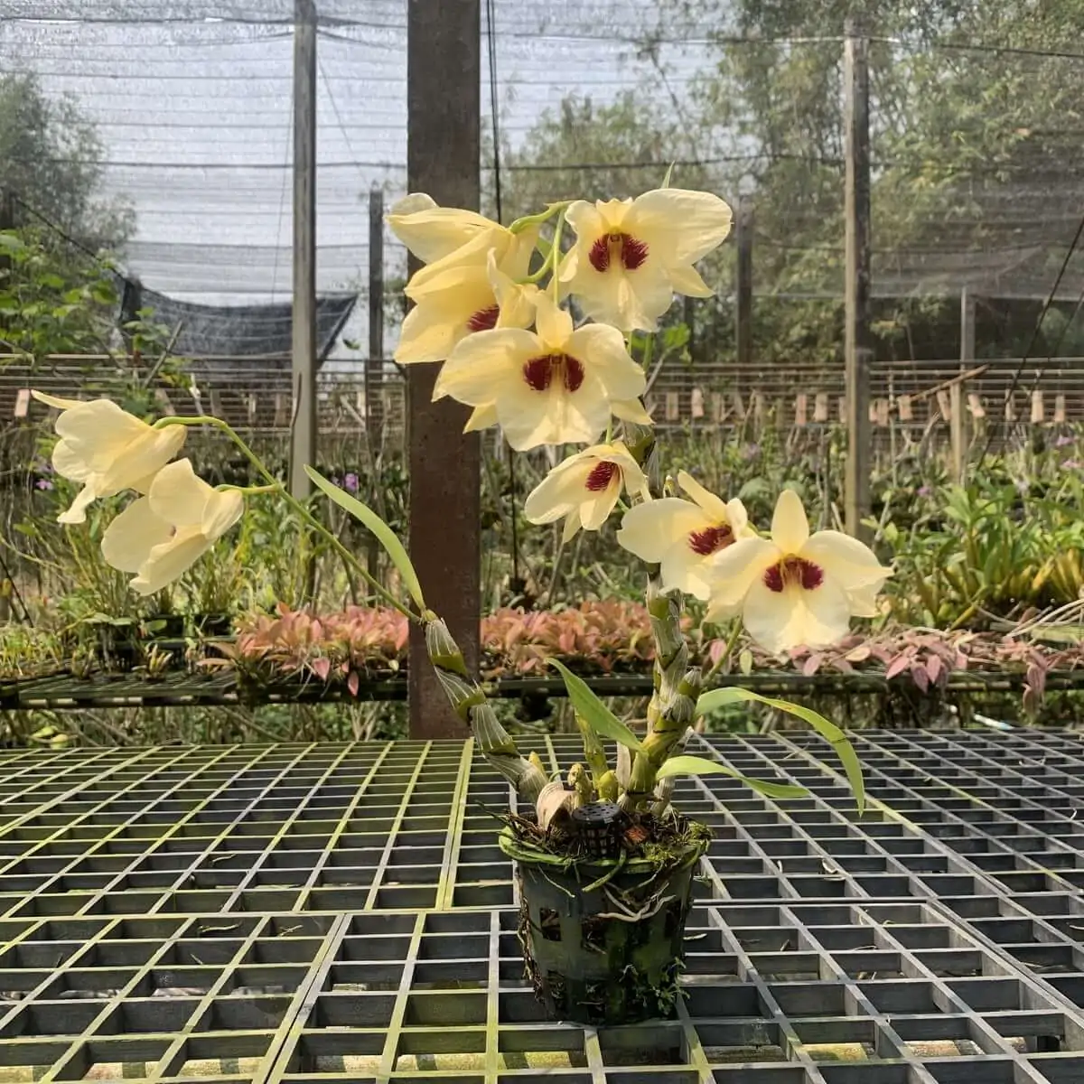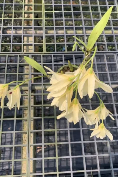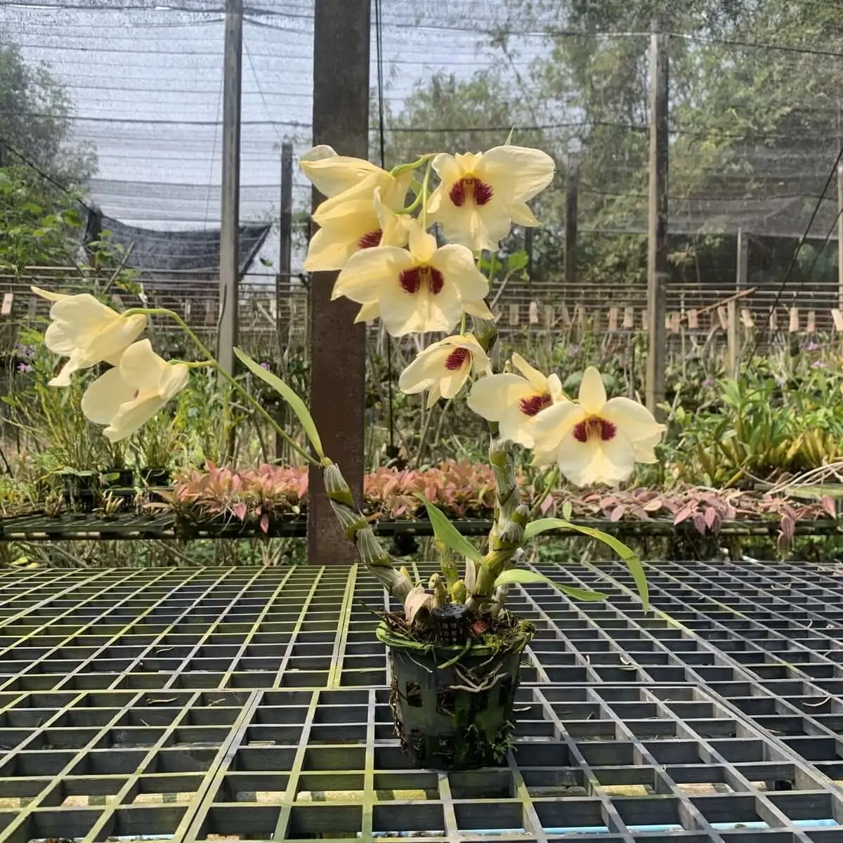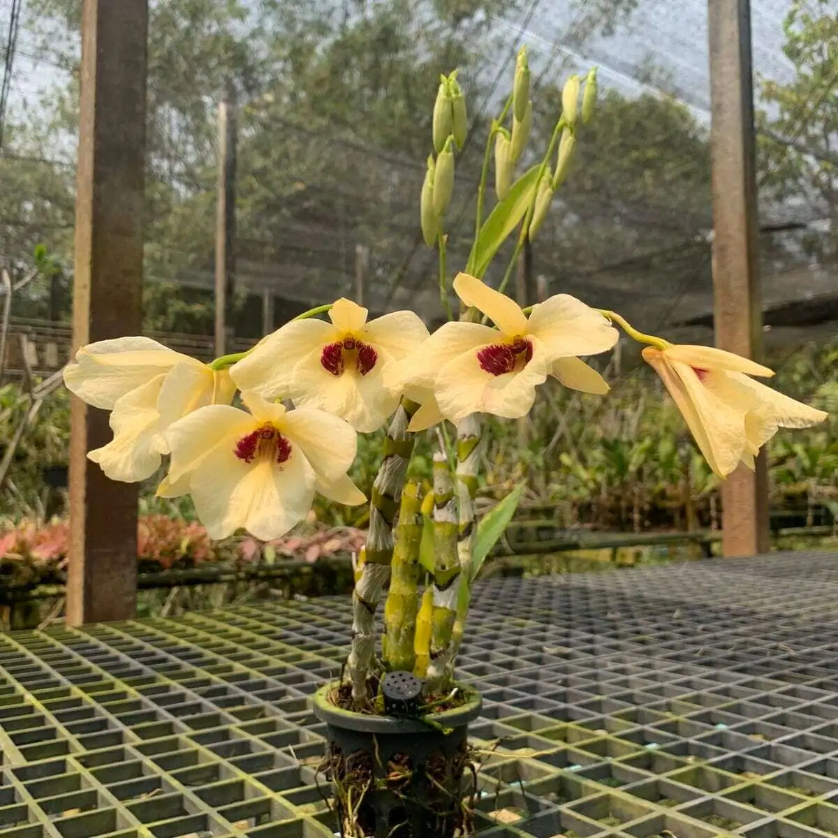 Accompanied by light green, somewhat translucent, deciduous leaves, this orchid takes center stage in spring. Its short, 2 to 7 flowered raceme delivers fragrant, fleshy, and remarkably long-lasting blooms. These exquisite flowers emanate from the upper nodes of more mature leafed and leafless canes, adding to their allure. For a well-deserved respite, Dendrobium albosanguineum seeks a semi-dry winter rest, making it a fascinating and captivating member of the orchid kingdom.