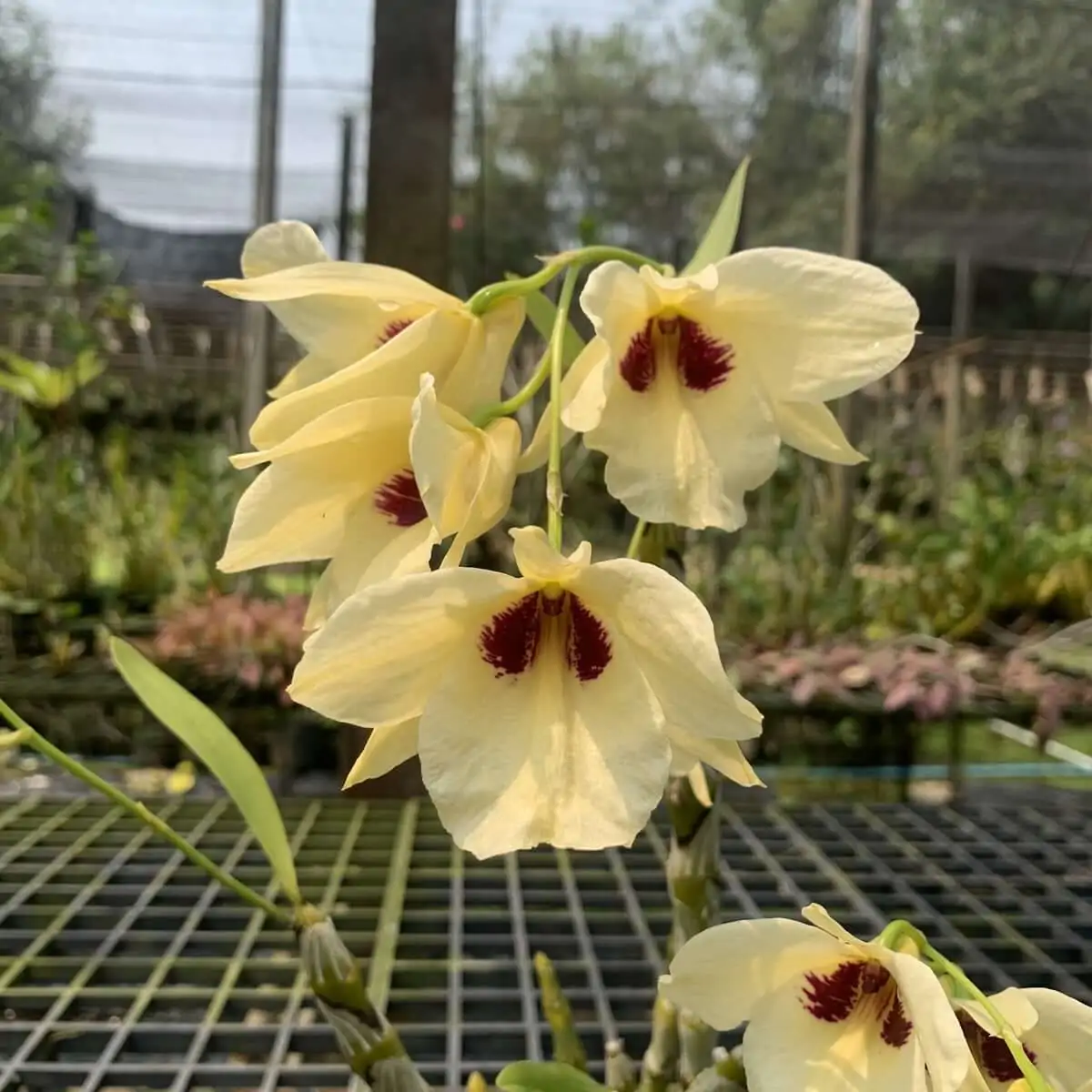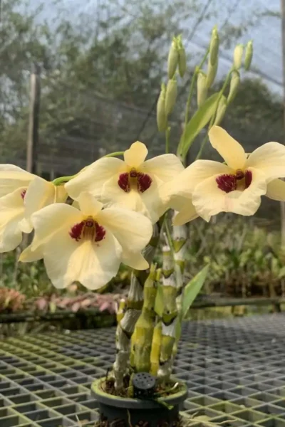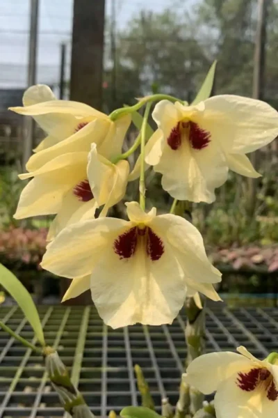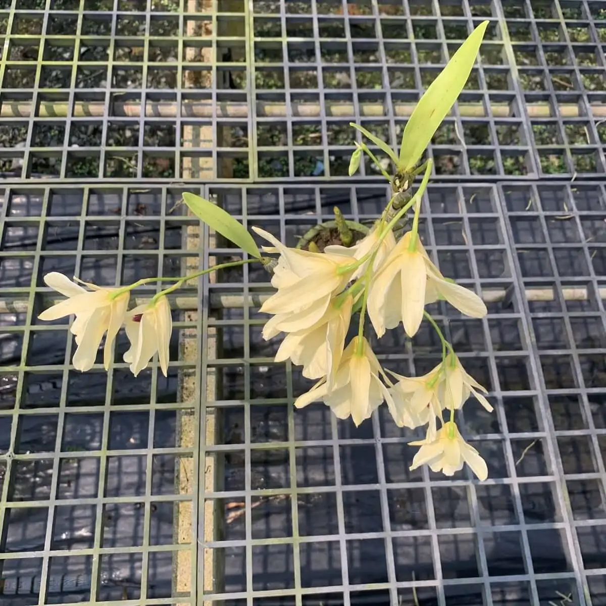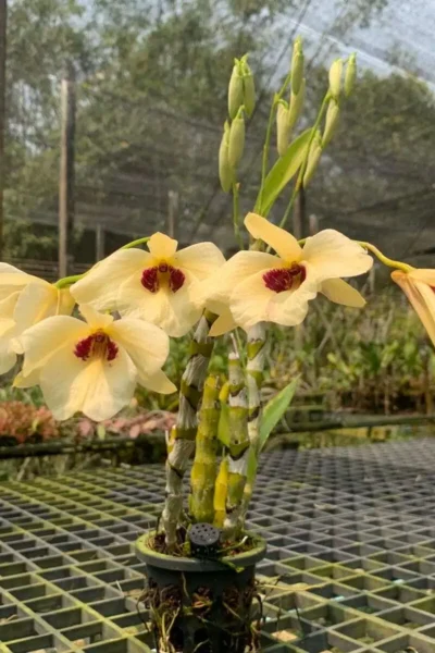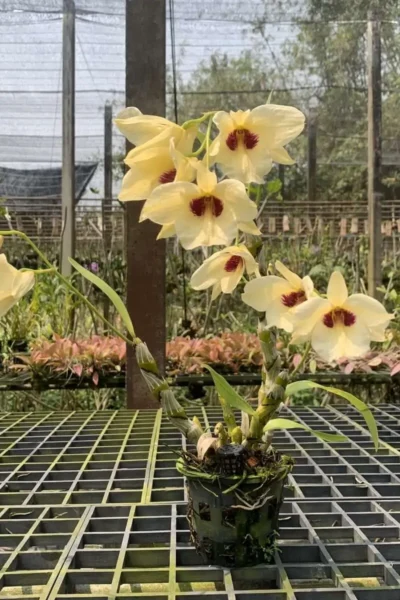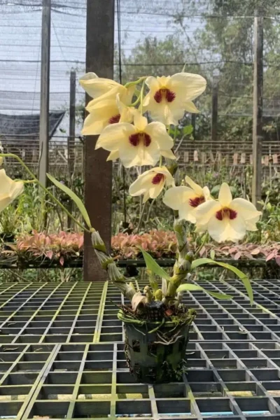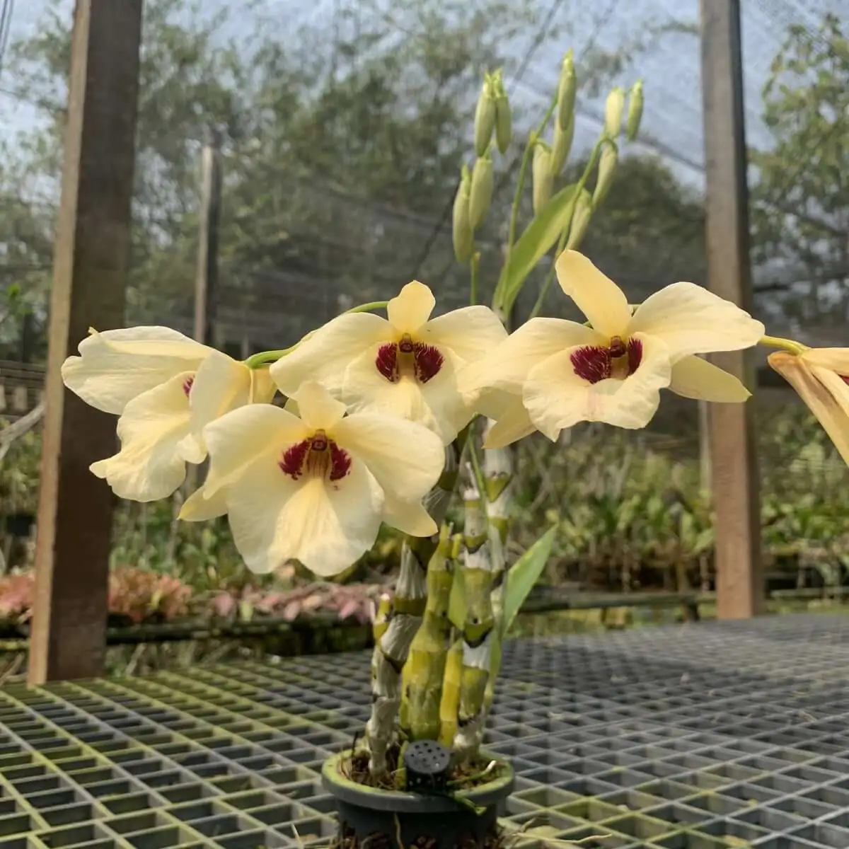 Accompanied by light green, somewhat translucent, deciduous leaves, this orchid takes center stage in spring. Its short, 2 to 7 flowered raceme delivers fragrant, fleshy, and remarkably long-lasting blooms. These exquisite flowers emanate from the upper nodes of more mature leafed and leafless canes, adding to their allure. For a well-deserved respite, Dendrobium albosanguineum seeks a semi-dry winter rest, making it a fascinating and captivating member of the orchid kingdom.