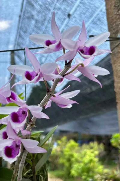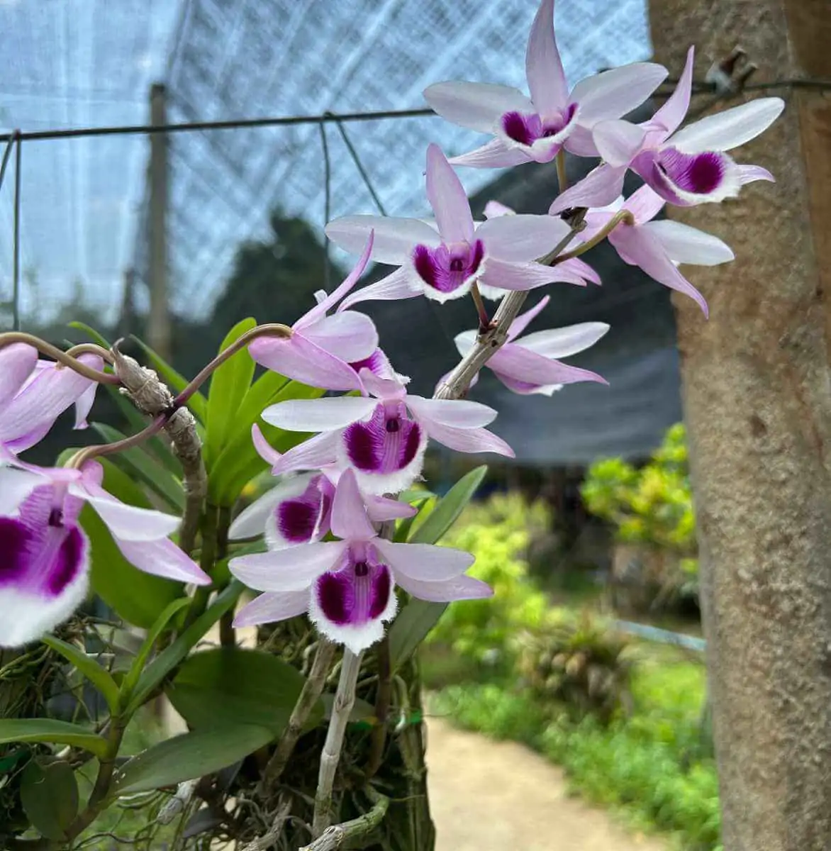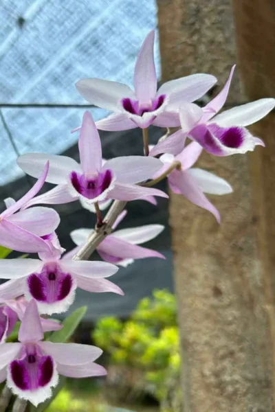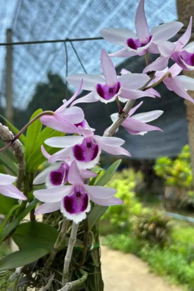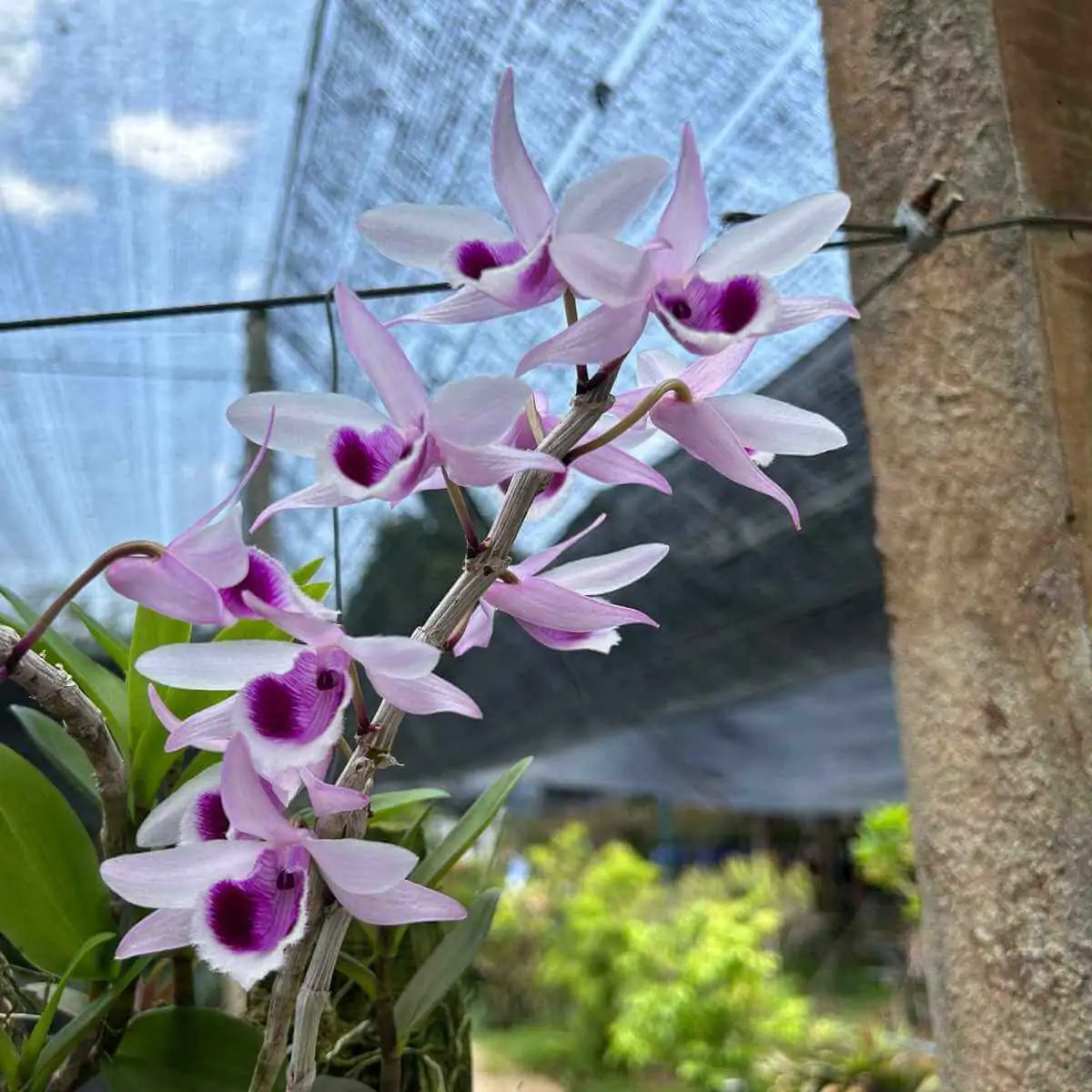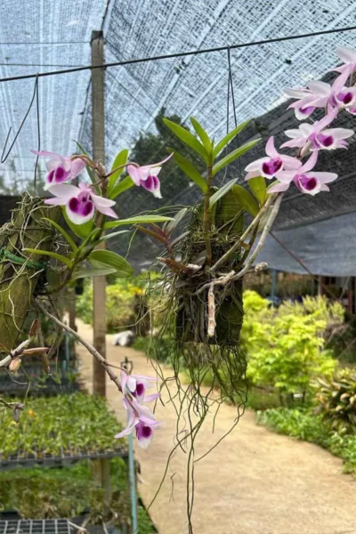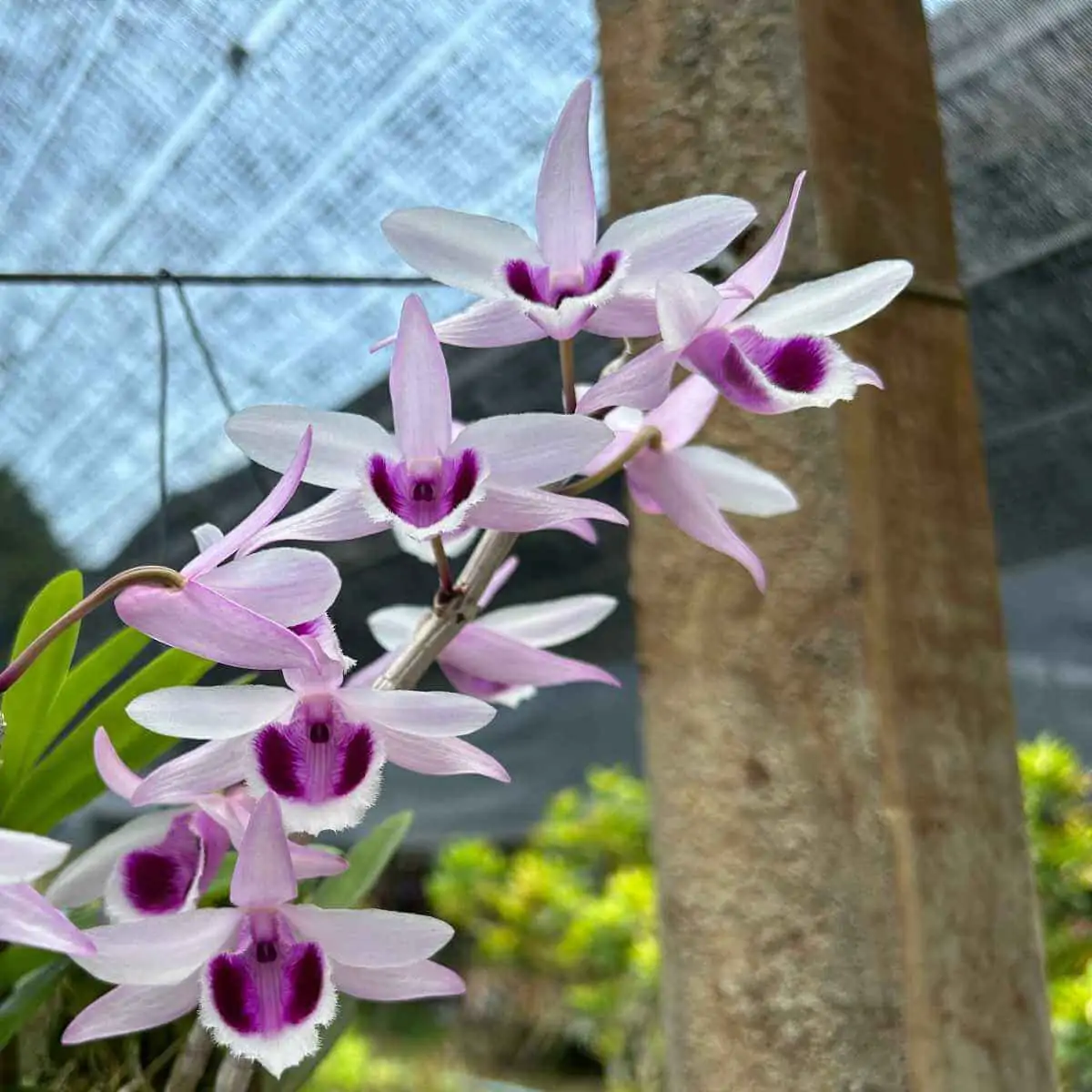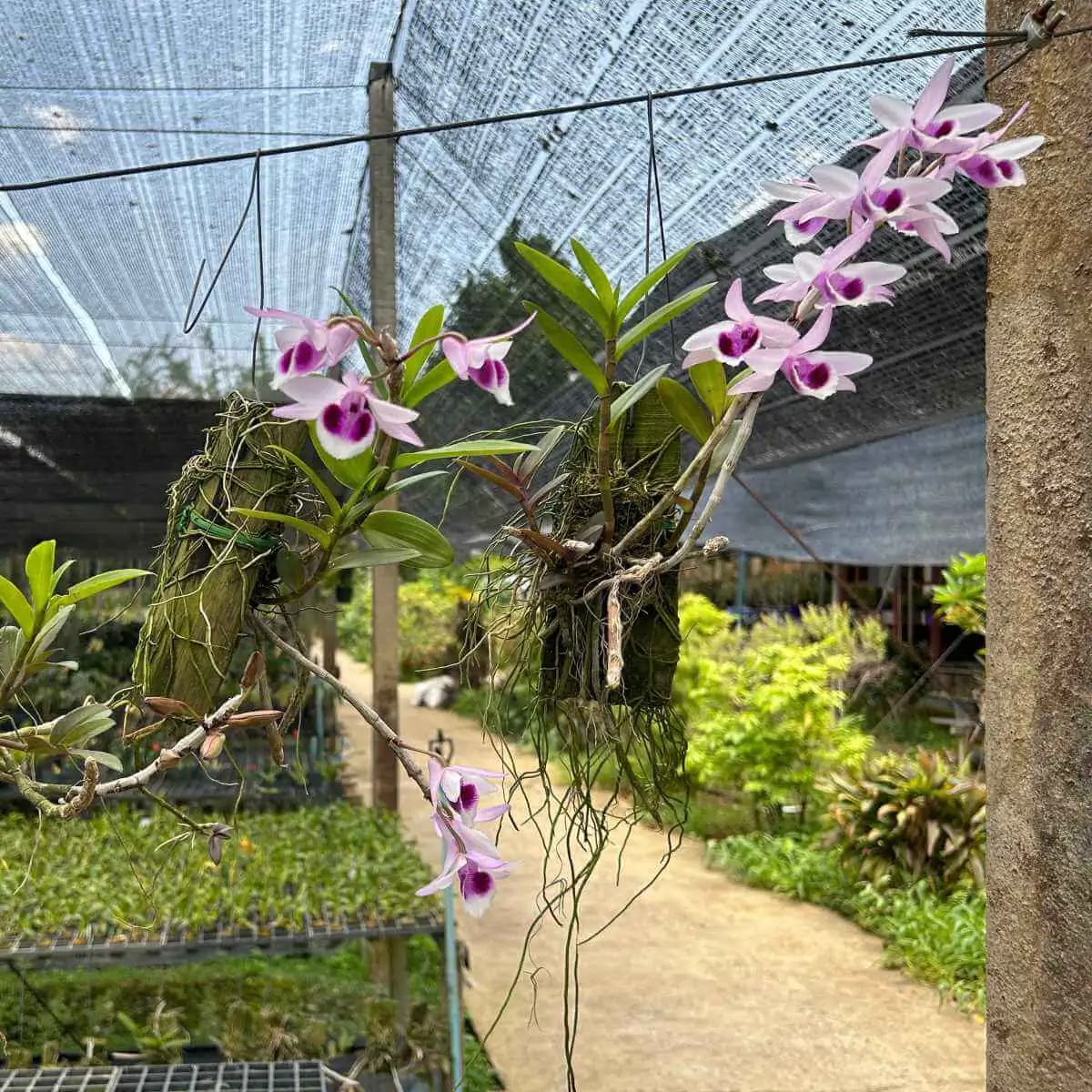 Dendrobium anosmum is a special orchid that hangs down elegantly, and it’s found in many interesting places. It likes a bit of dry time and a bit of wet time. When it blooms, you’ll see pretty flowers along its stick-like stems. Just make sure to water it when it’s growing new parts, and it’ll be a happy and beautiful part of your garden.