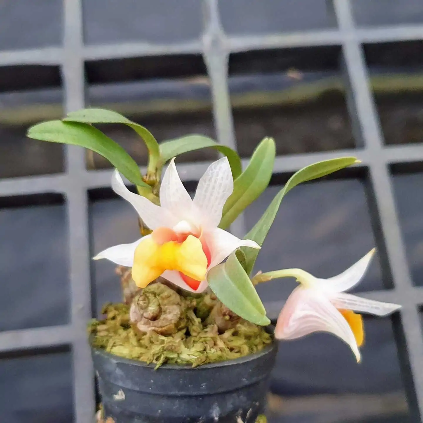 A charming miniature orchid known for its beautiful white flowers and sweet fragrance. Dendrobium bellatulum produces elegant blooms with a soft texture and subtle markings, making it a favorite among collectors of compact and fragrant species.