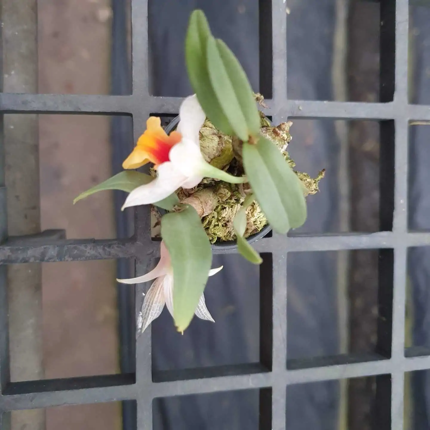 - Flowers: White, lip blooms with soft yellow to orange tones at the center