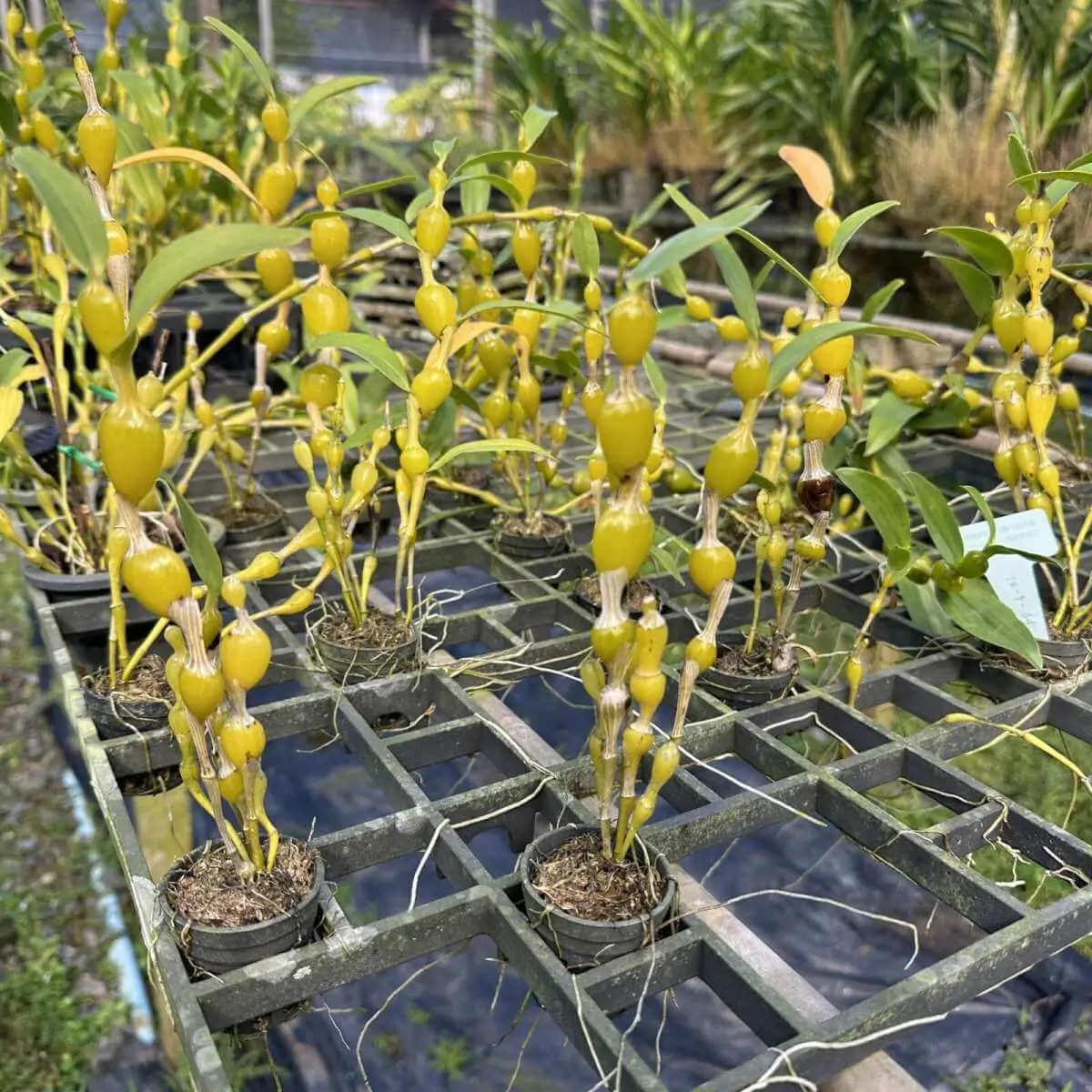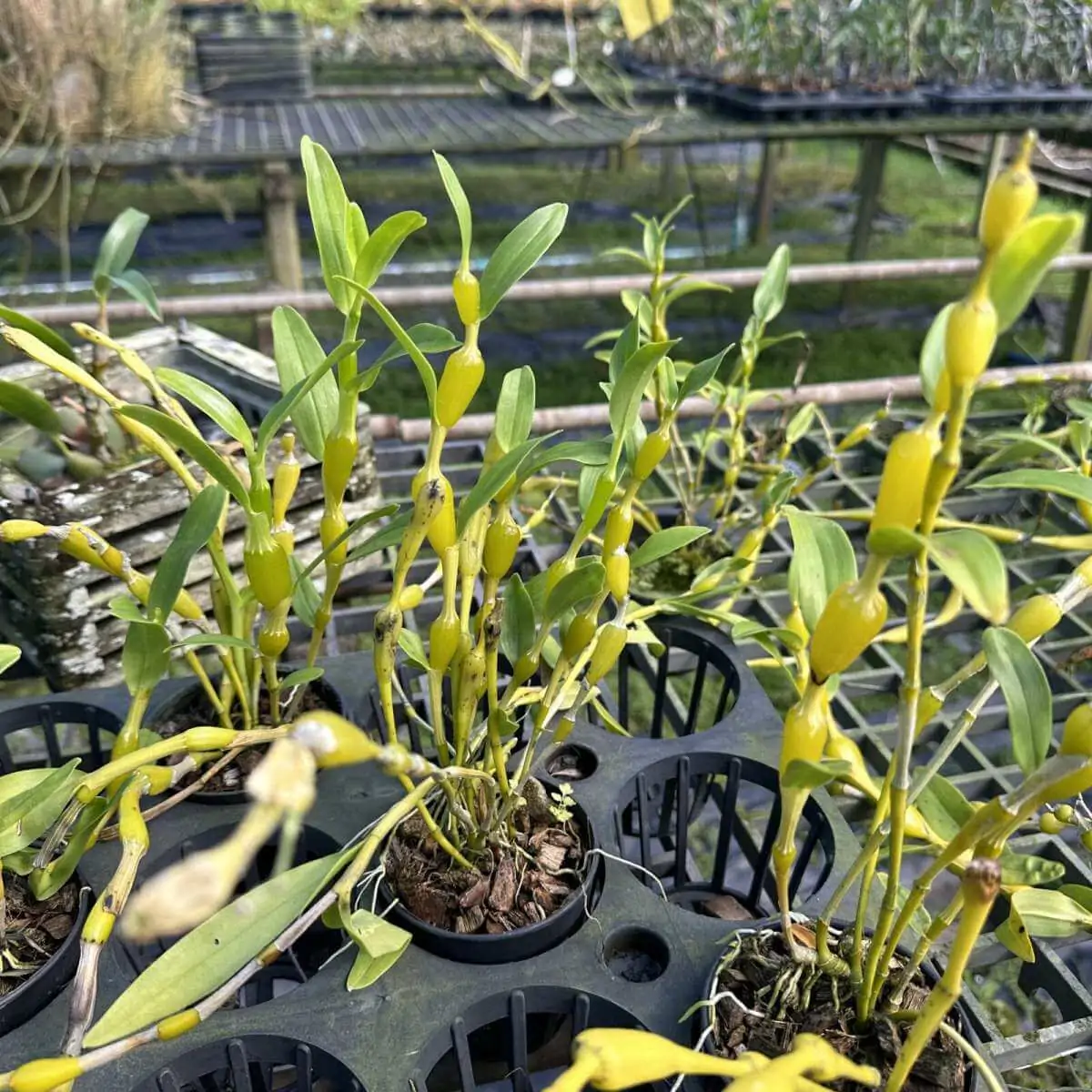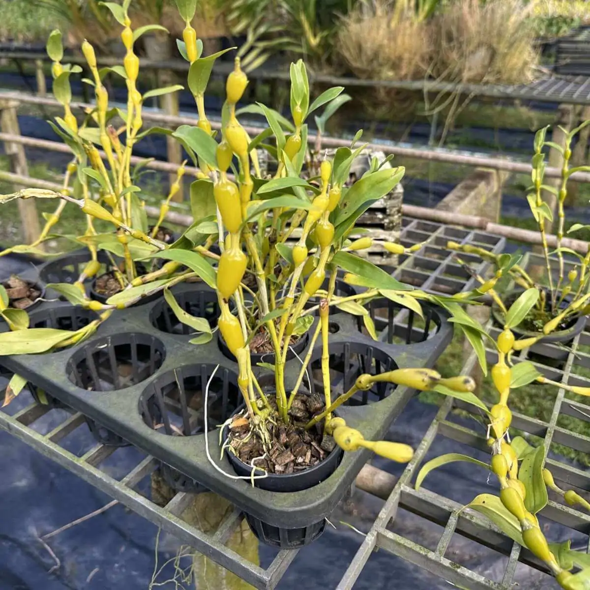 Dendrobium findlayanum is a stunning deciduous orchid species prized for its long, arching canes and elegant, pendant blooms. Each cane produces multiple soft yellow flowers with a beautifully textured lip, creating a graceful cascading display when in full bloom.