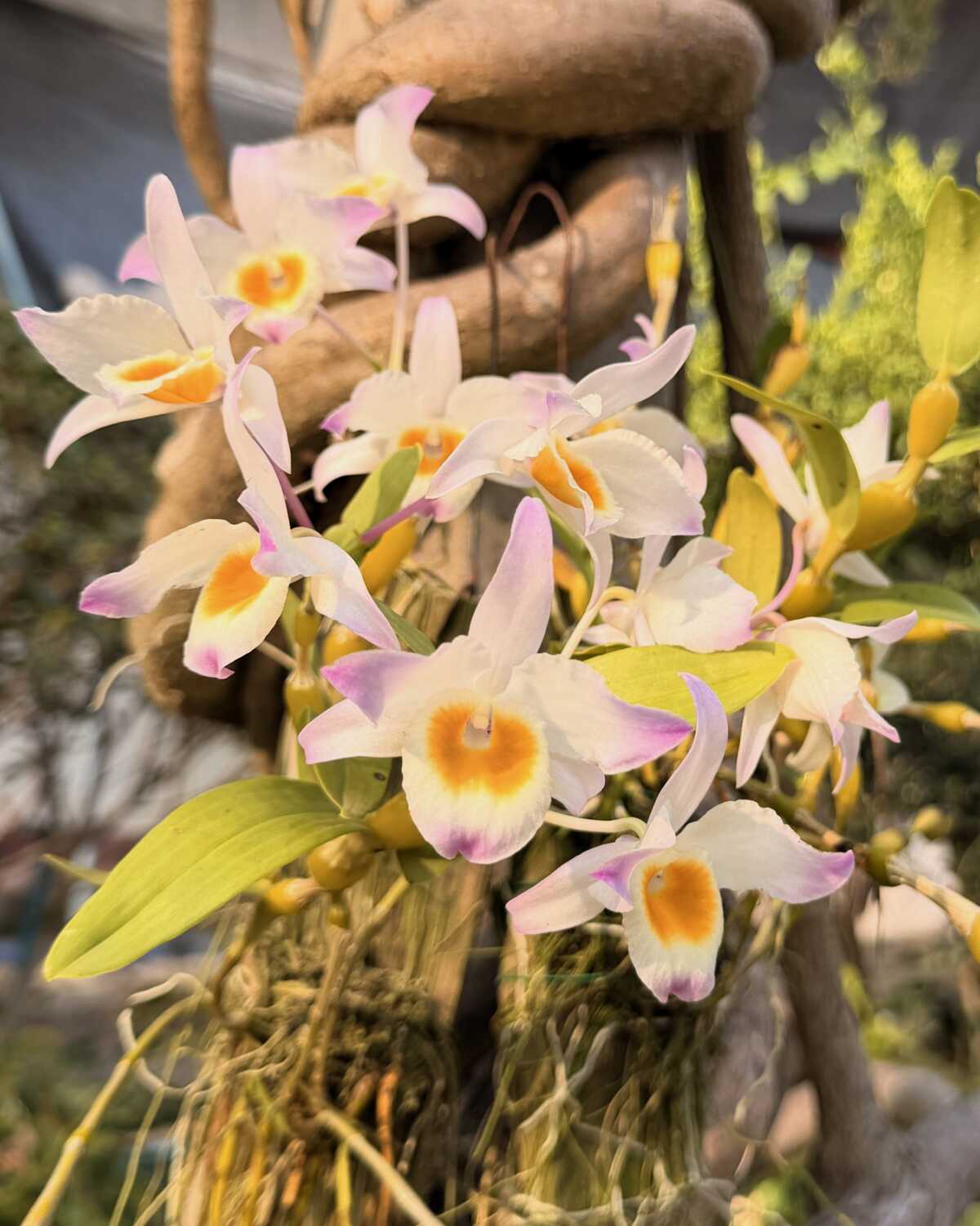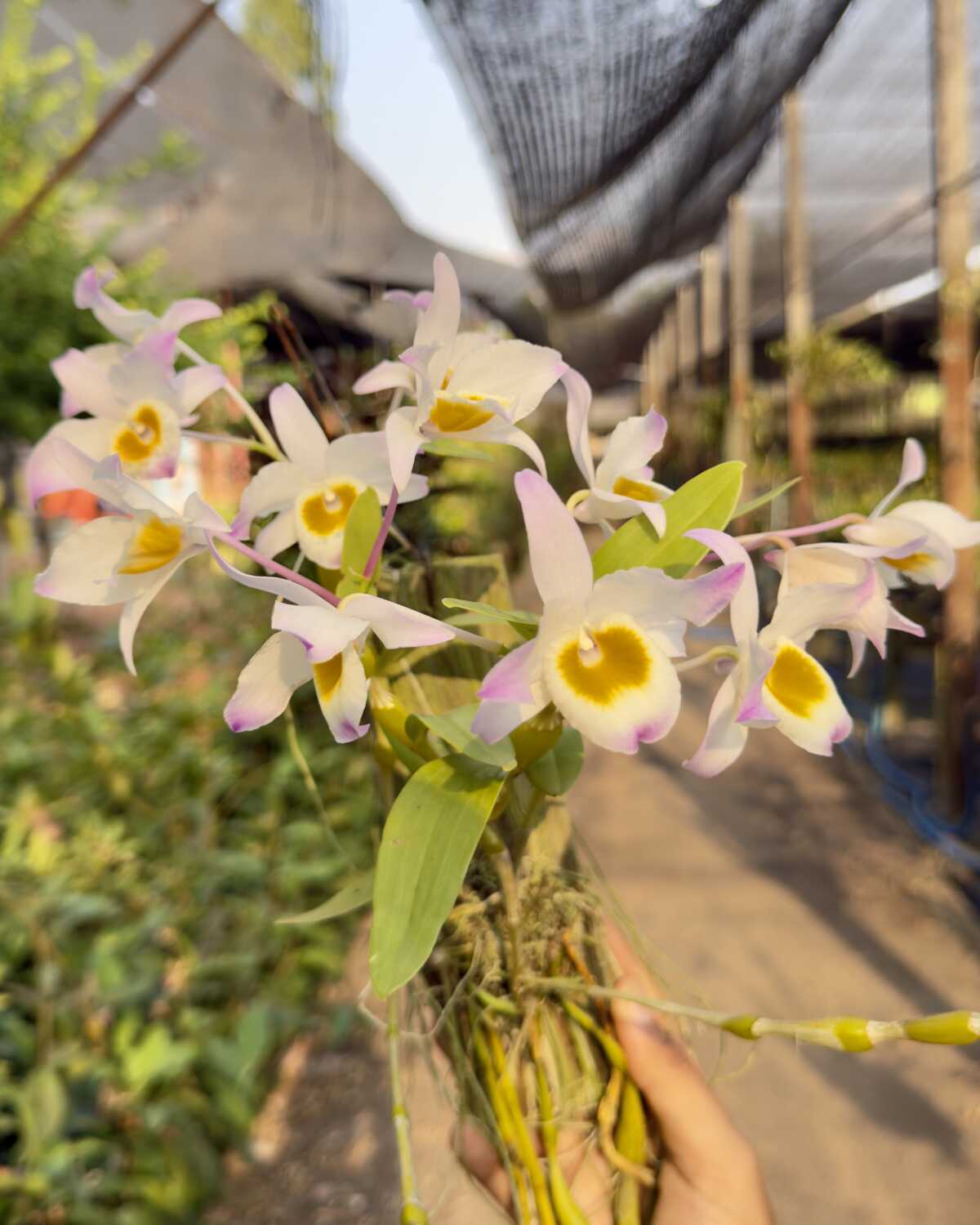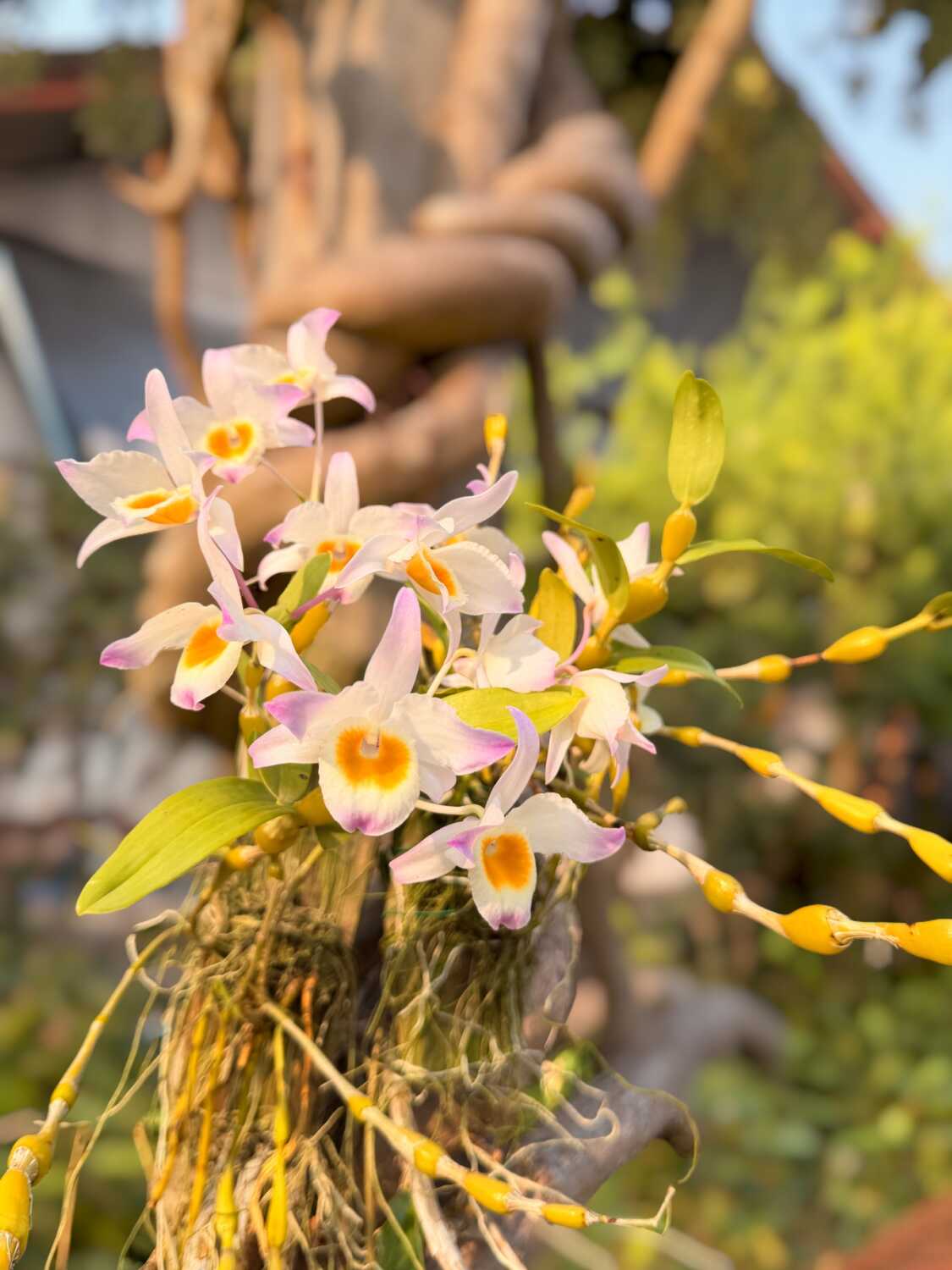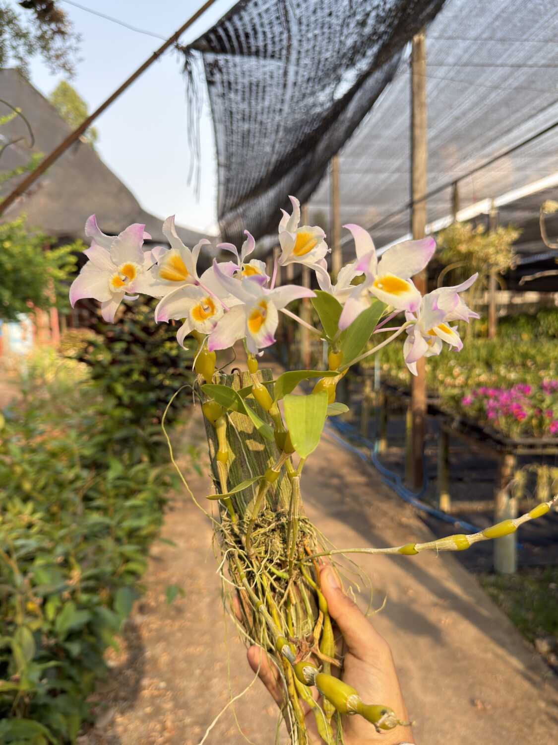 Dendrobium findlayanum is a stunning deciduous orchid species prized for its long, arching canes and elegant, pendant blooms. Each cane produces multiple soft yellow flowers with a beautifully textured lip, creating a graceful cascading display when in full bloom.
