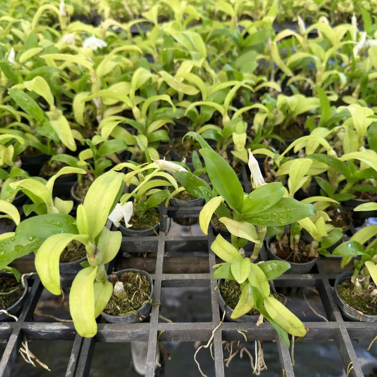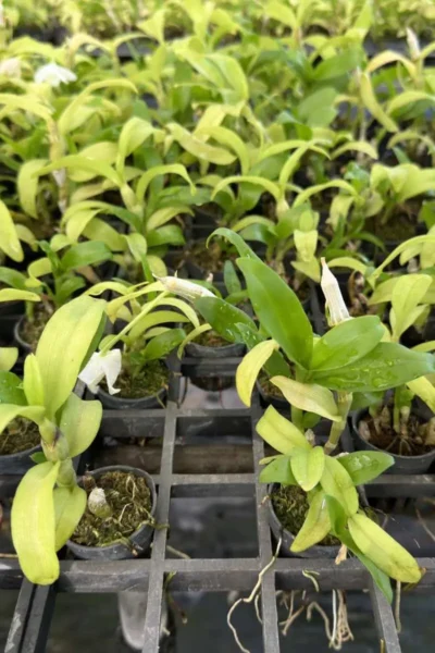 This is a 1 plant near blooming size Dendrobium parishii, currently growing in a 1-inch pot. Each plant stands approximately 5–7 inches tall, well-rooted and showing healthy cane growth, ready to bloom in the next flowering cycle with proper care.