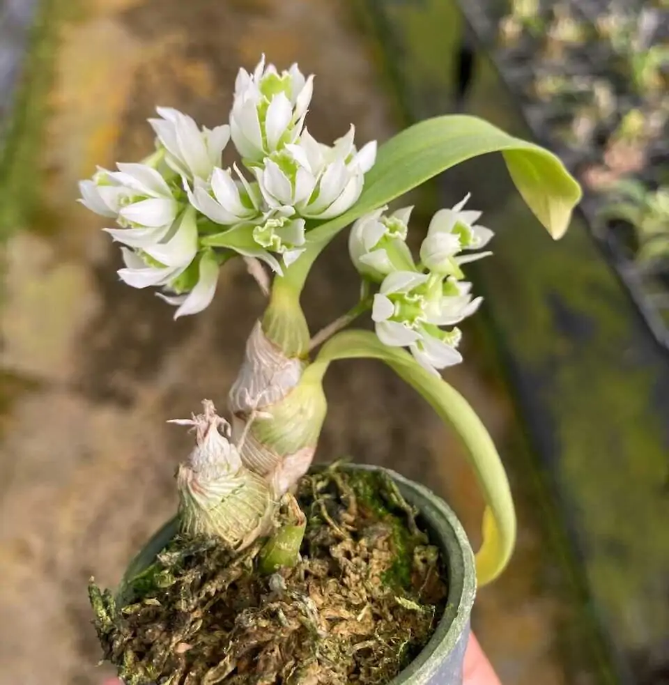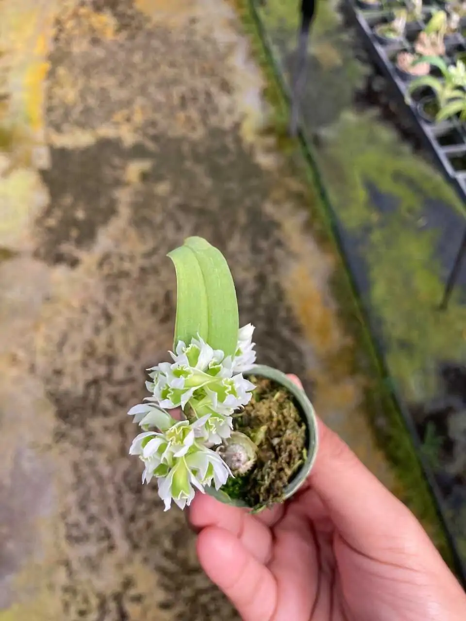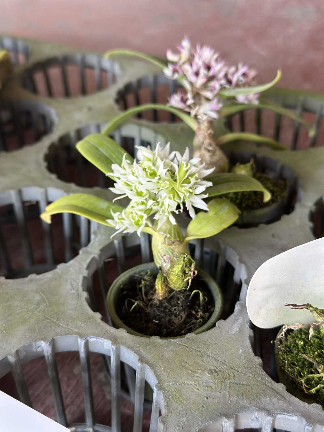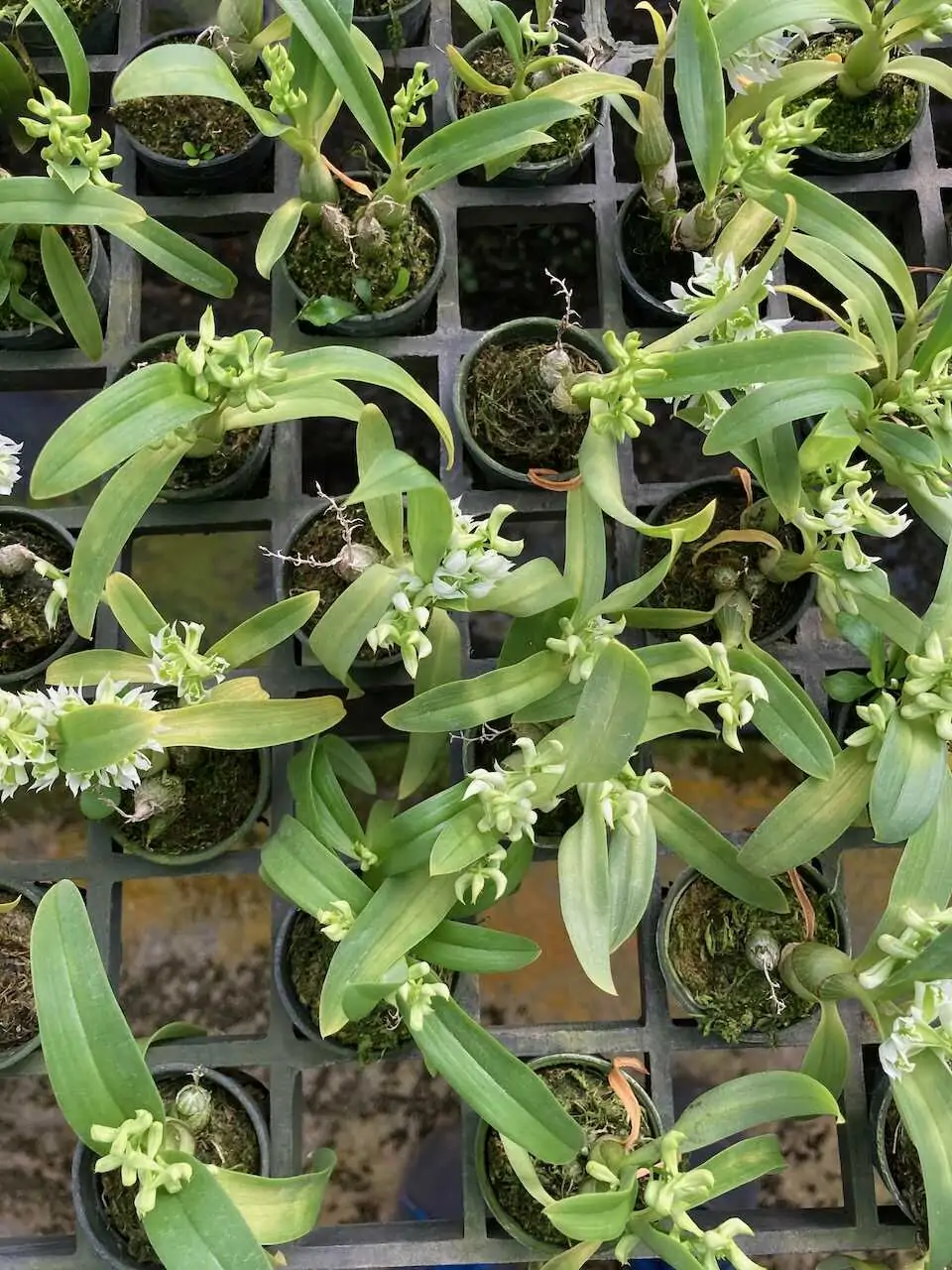 Dendrobium peguanum alba, Alba form of the miniature Dendrobium peguanum species. This seedling is a true gem for orchid collectors who appreciate subtle beauty and compact growth.