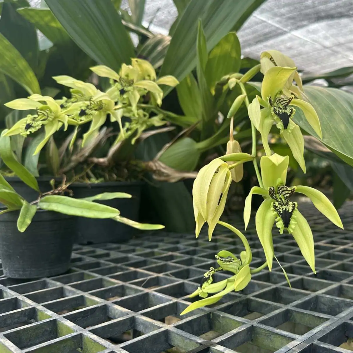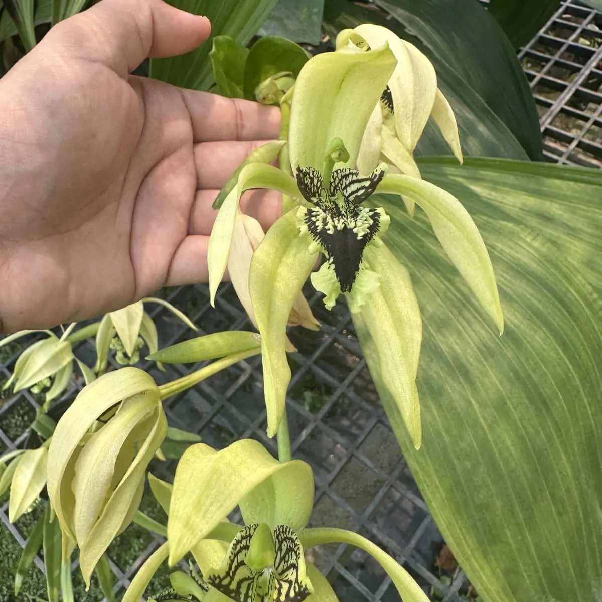 - Individual flowers are large (3-4 inches wide) with a long, striking, black-marked lip and greenish sepals and petals.