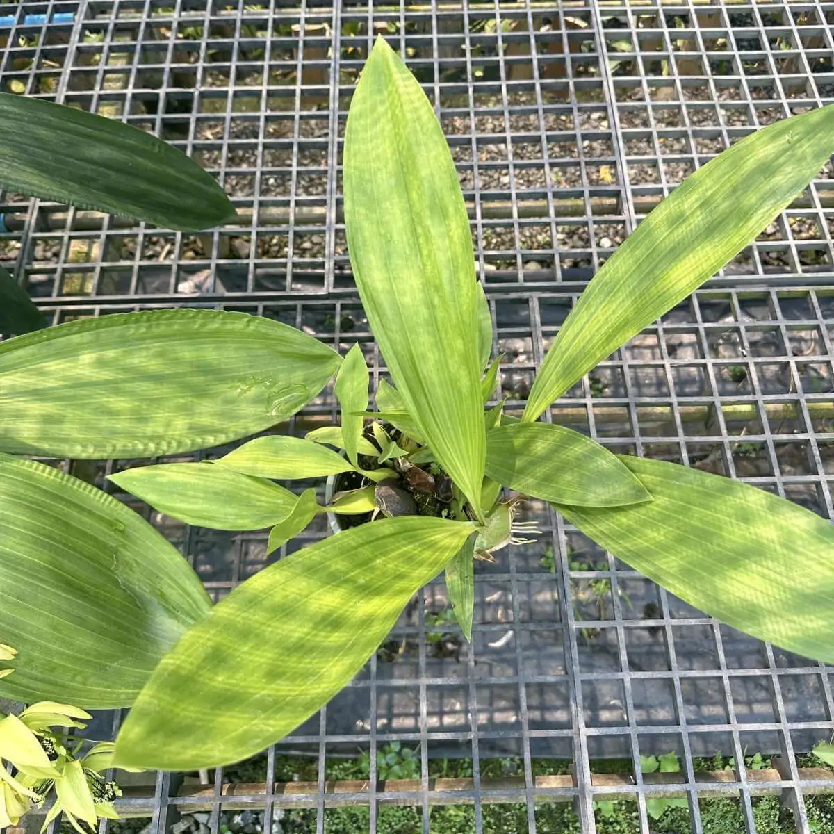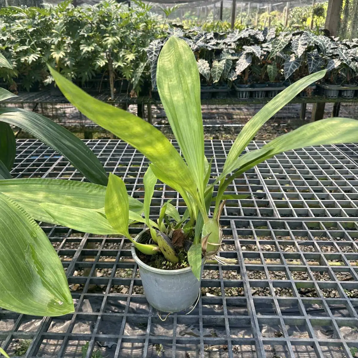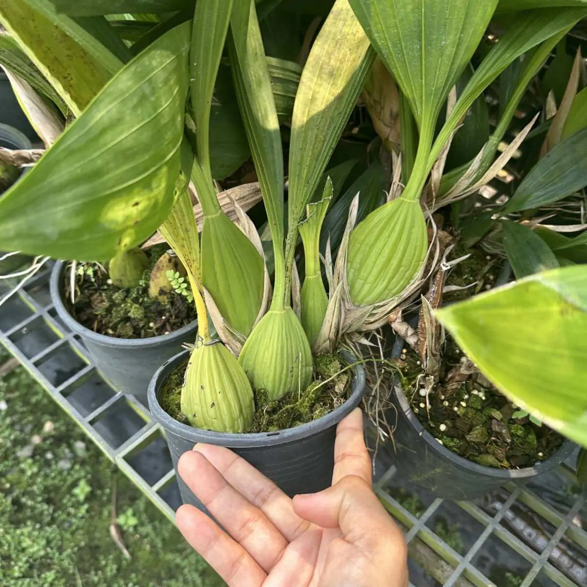 - Features green, flattened pseudobulbs spaced along a thick rhizome.