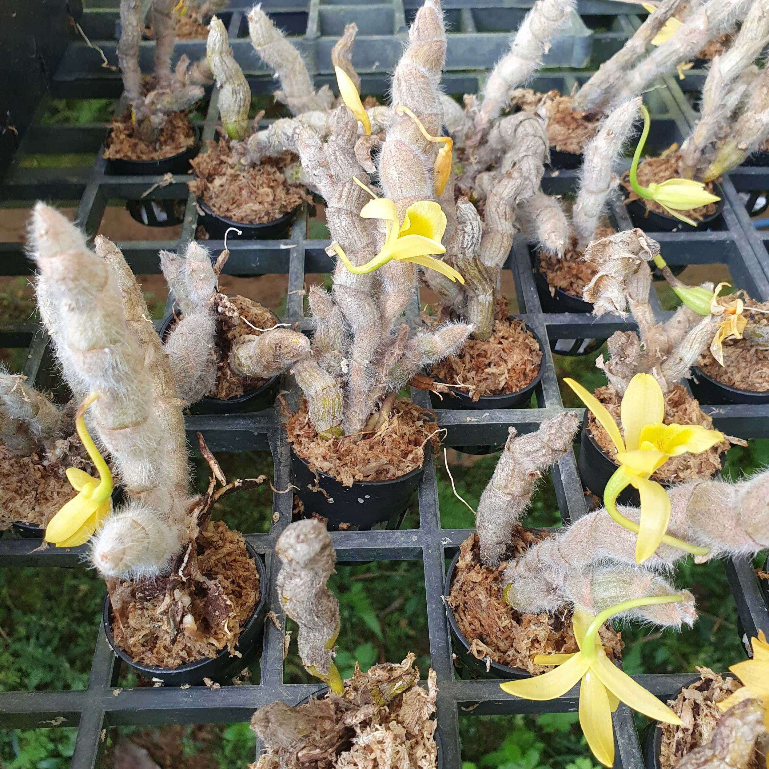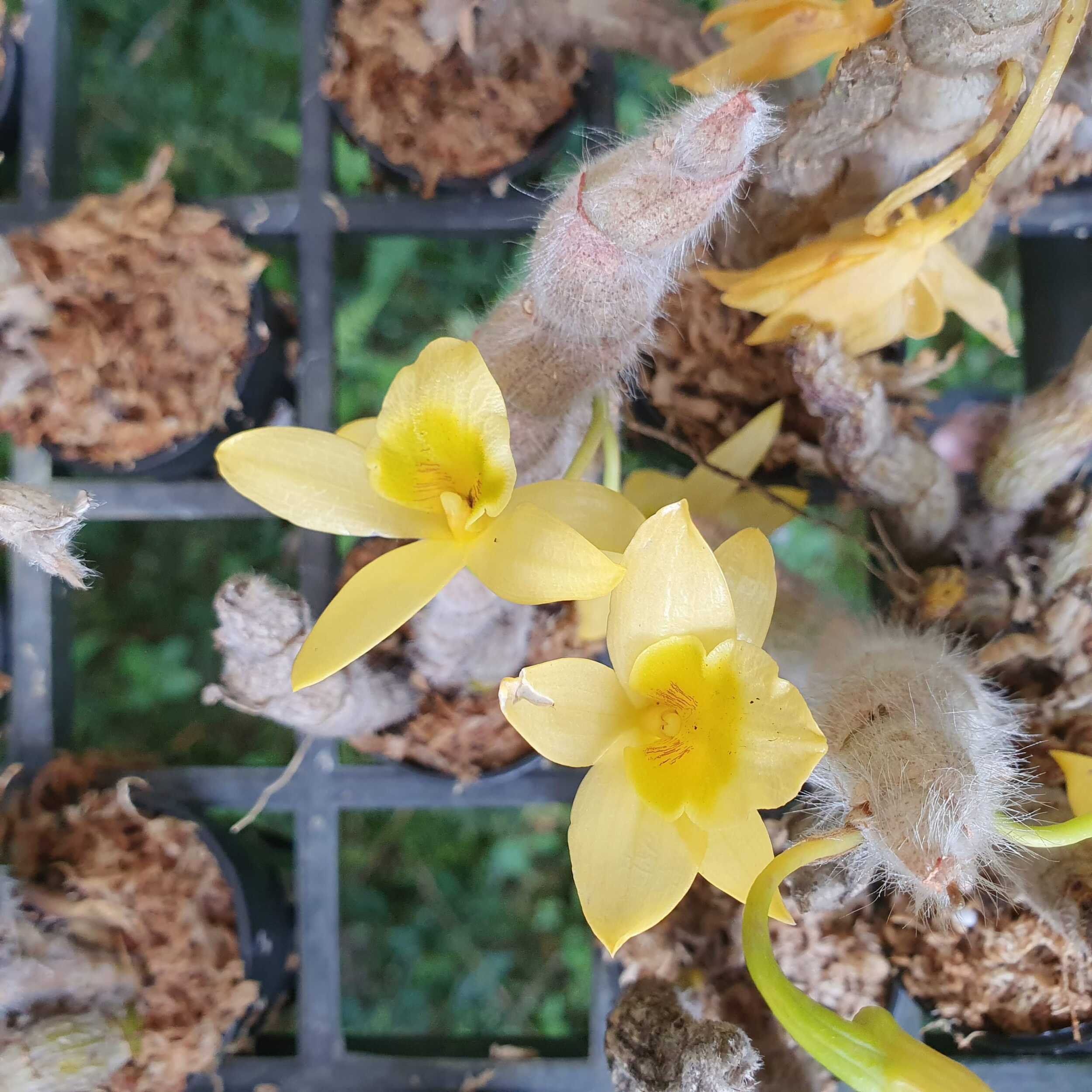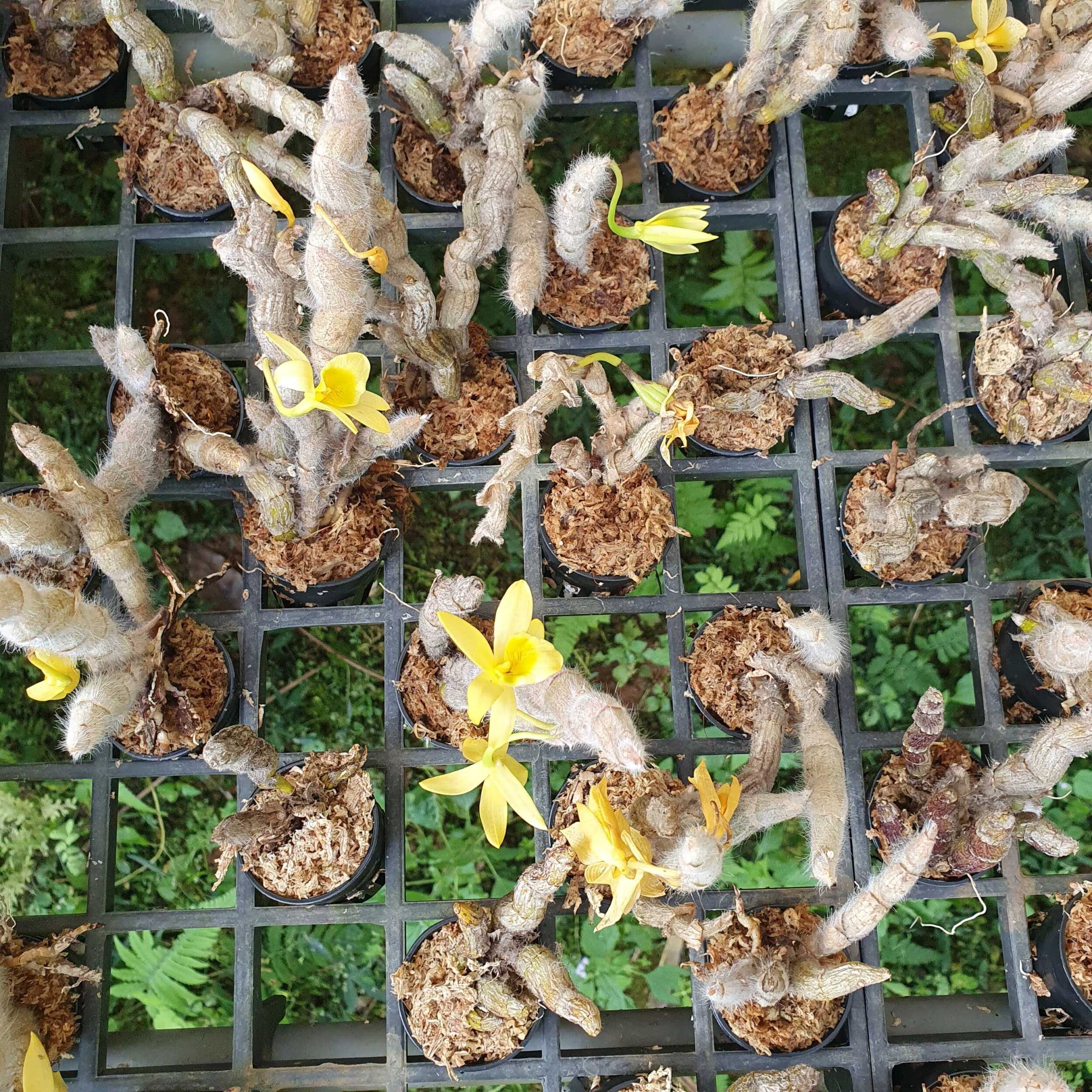 A truly unusual miniature orchid covered in soft white hairs, producing charming yellow blooms with a light lemon scent — a must-have for collectors.