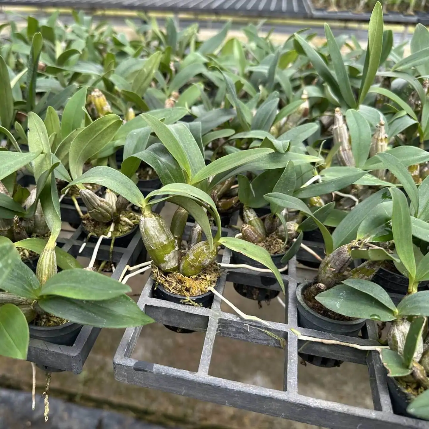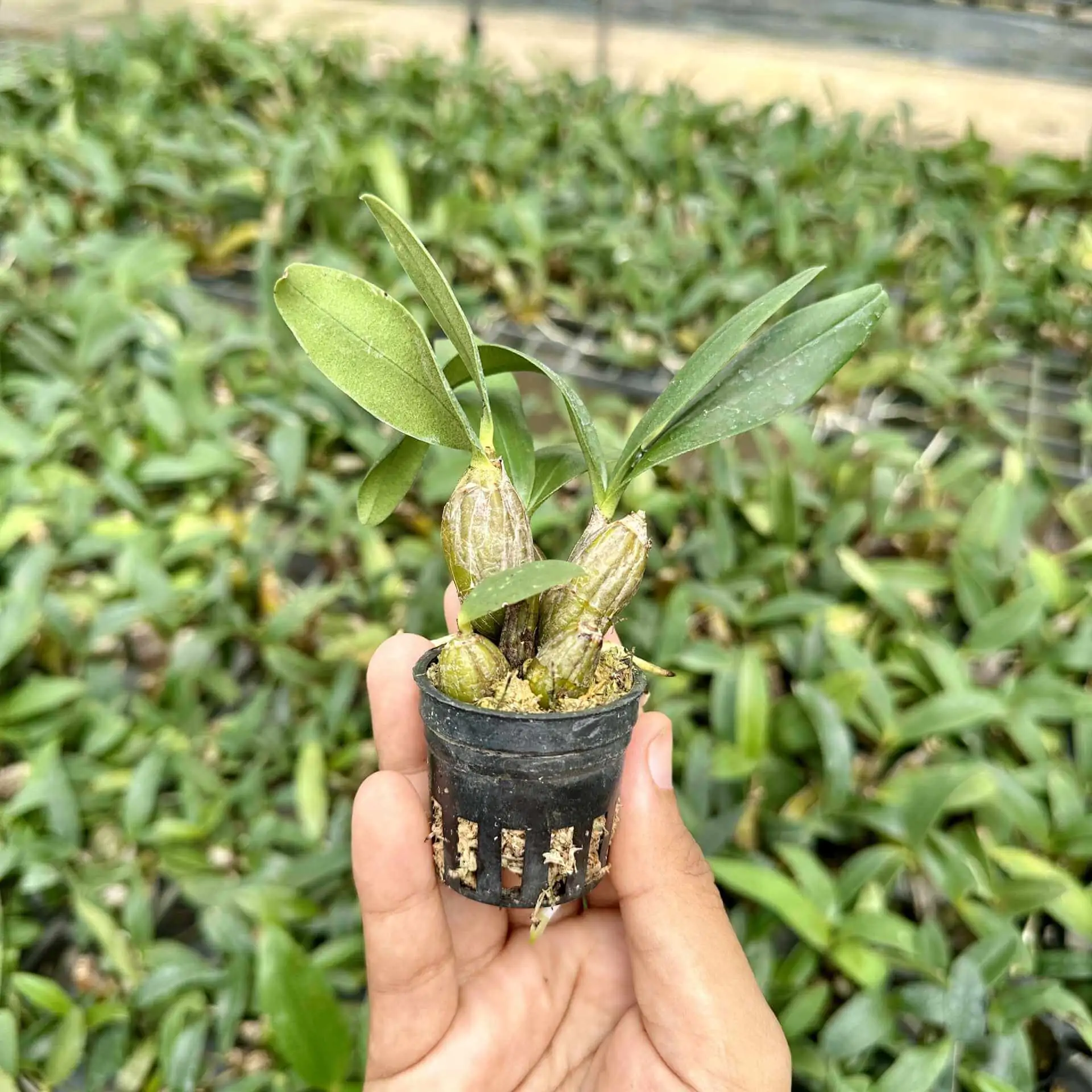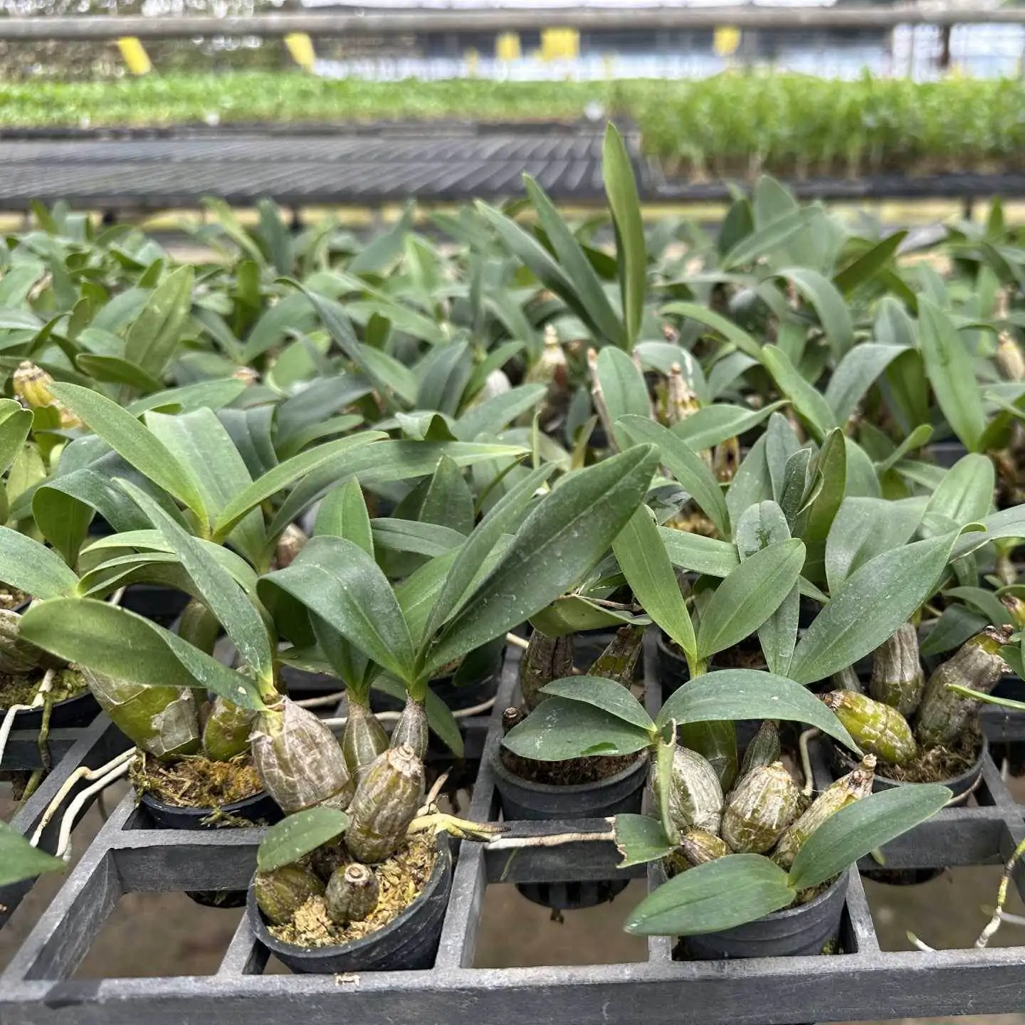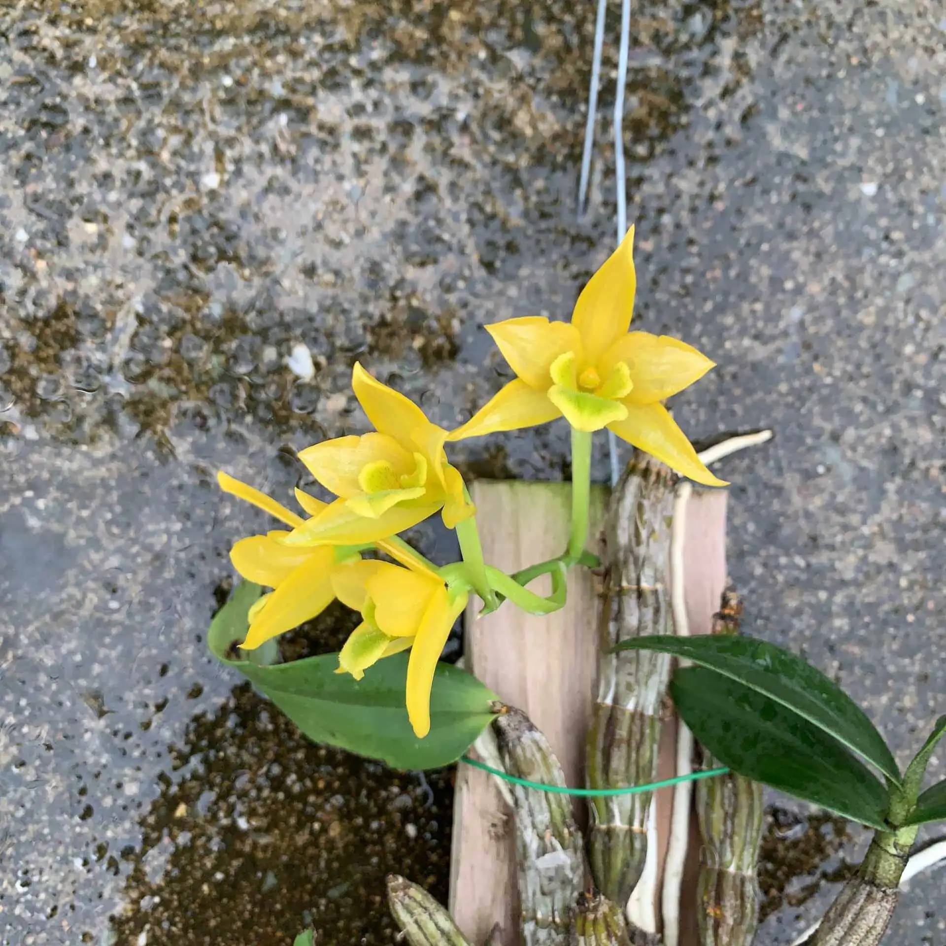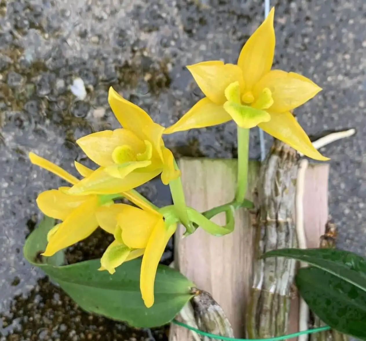 Dendrobium trigonopus compact orchid species known for its vibrant yellow-green flowers with a unique triangular lip and pleasant fragrance.