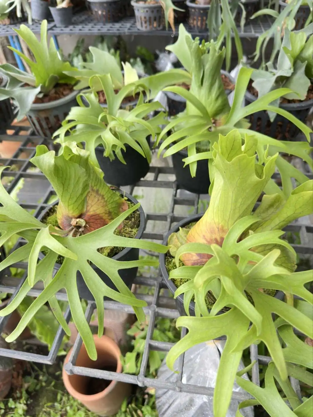 Platycerium coronarium Philippine form is a majestic staghorn fern known for its long, cascading fertile fronds that can reach over a meter in length. This tropical epiphyte thrives in warm, humid environments and develops stunning antler-like fronds that create a dramatic hanging effect—perfect for mounting or hanging baskets.