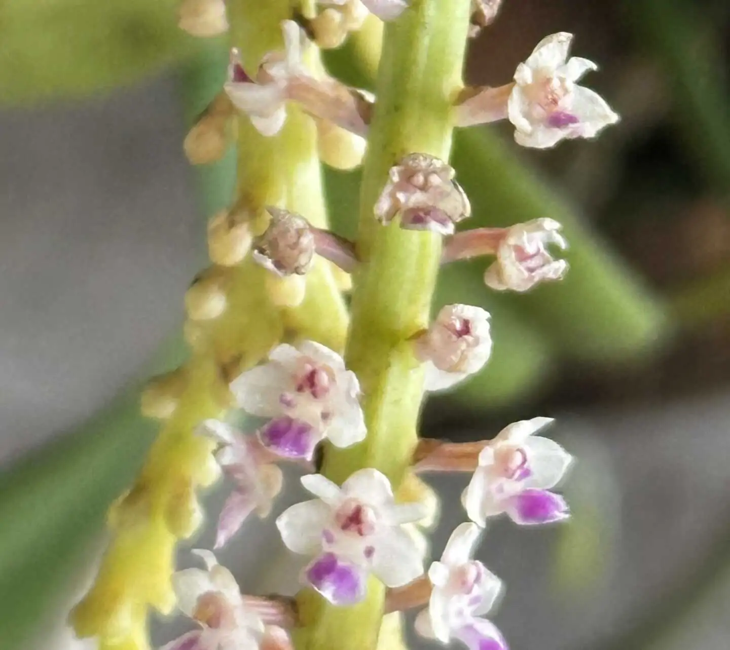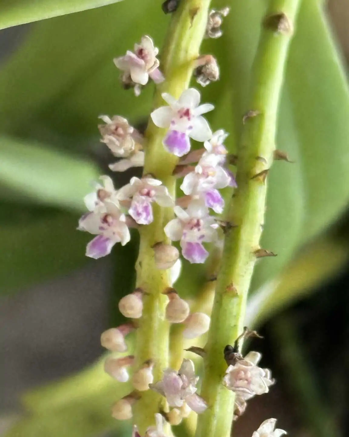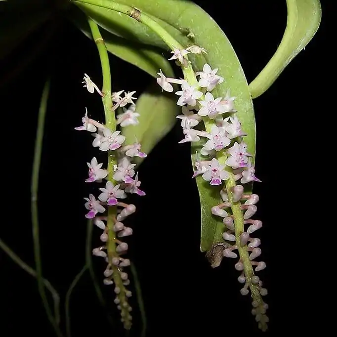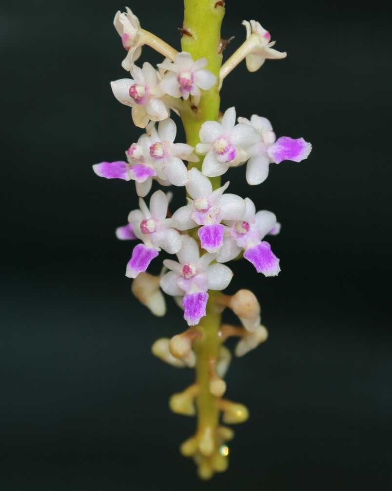 Smitinandia micrantha is a small, delicate orchid species native to Southeast Asia, and Thailand. This miniature orchid is known for its compact growth and charming, fragrant flowers. The blooms are typically white or pale pink with subtle markings, emerging from slender inflorescences. Its leaves are narrow and elongated, contributing to its elegant appearance. Smitinandia micrantha thrives in humid, shaded environments, often growing in mossy areas or on trees. Due to its small size and beautiful flowers, it is a favorite among orchid collectors and enthusiasts, especially those interested in