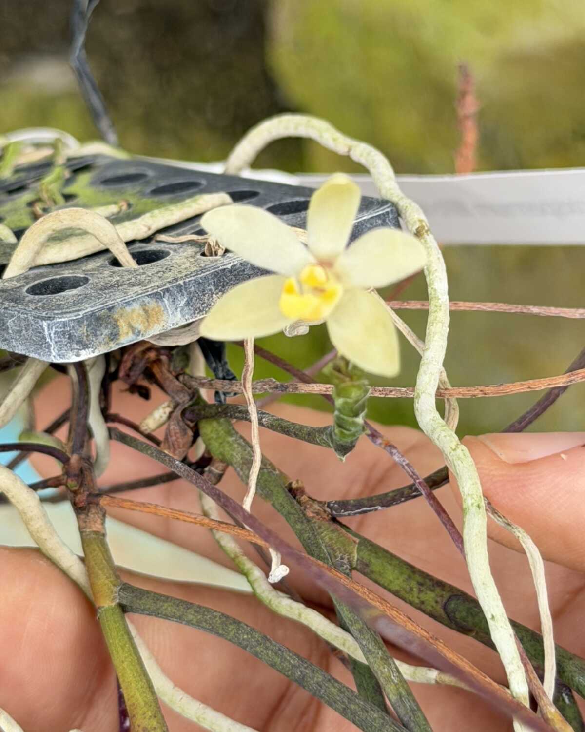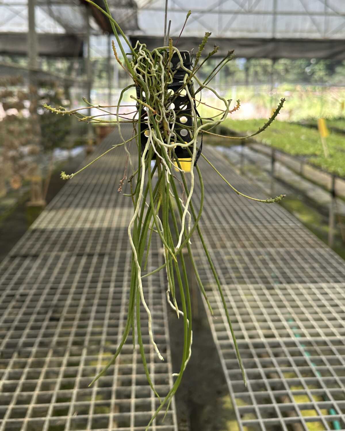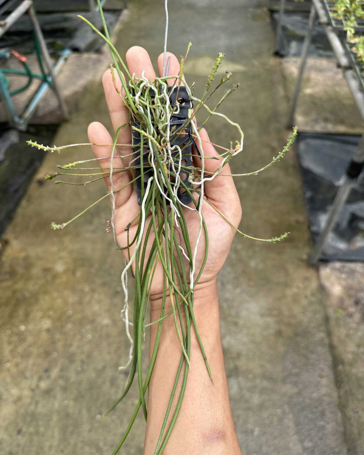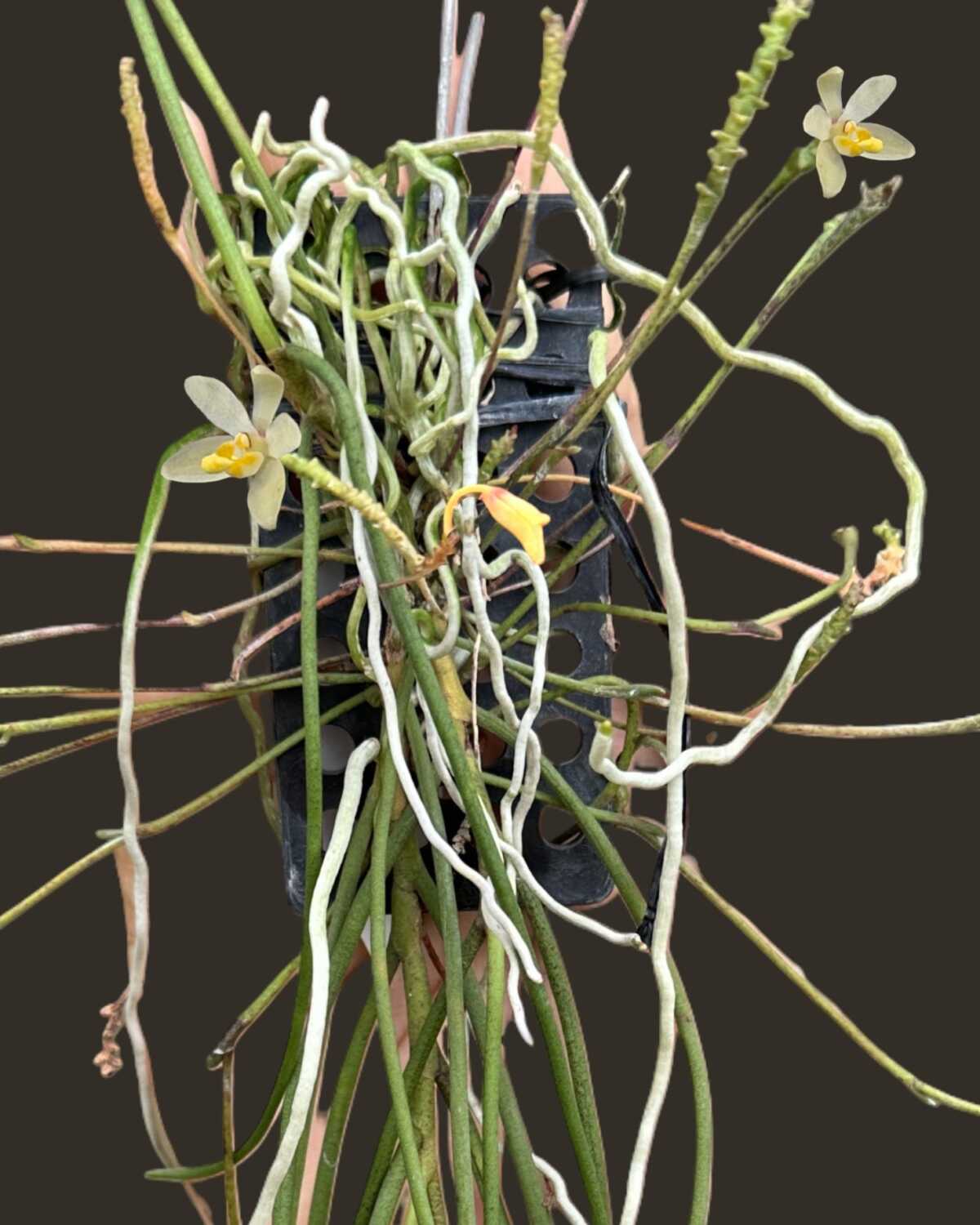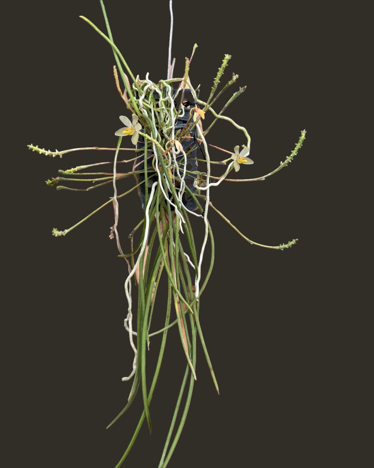 This plant is offered at blooming size and comes mounted on a plastic pad with a support stick, making it easy to hang or display in warm and humid growing conditions. With proper care, Thrixspermum filiforium can bloom reliably and adapt well to mounted culture.